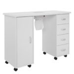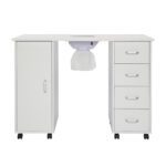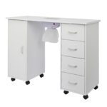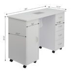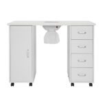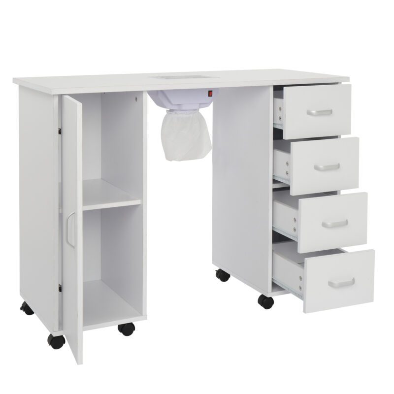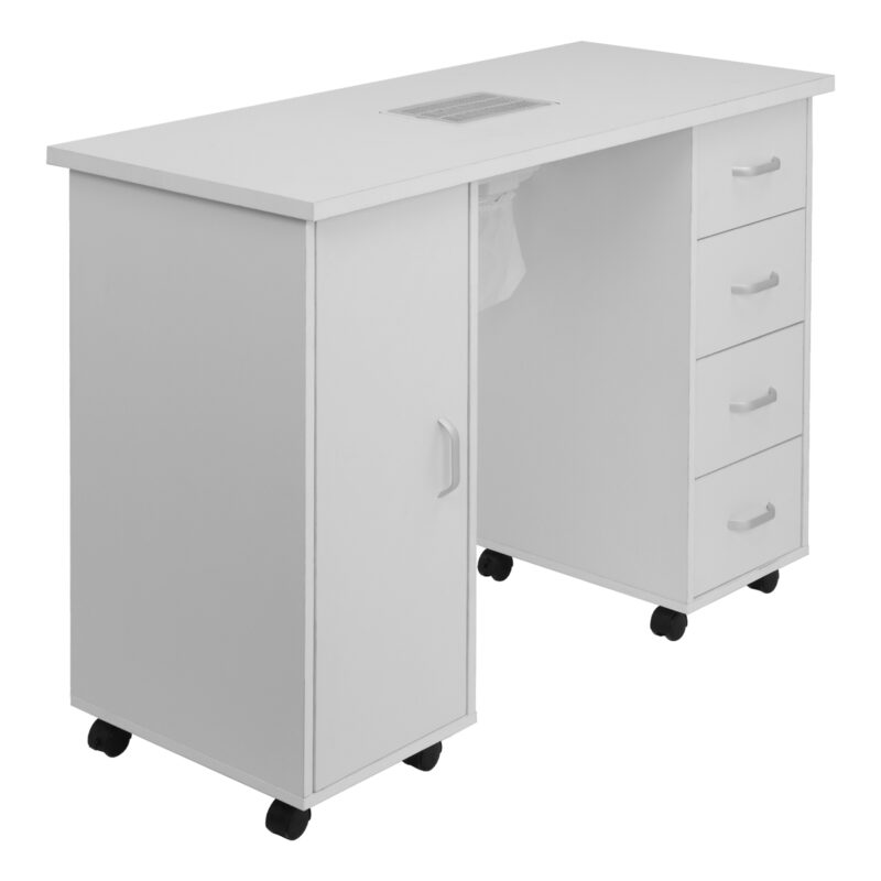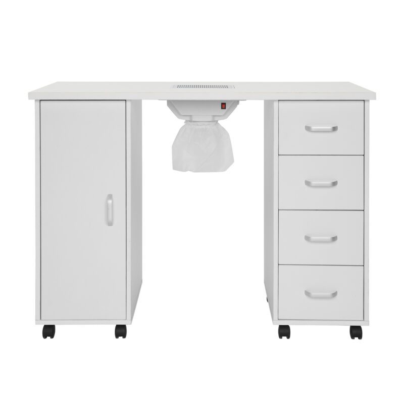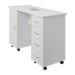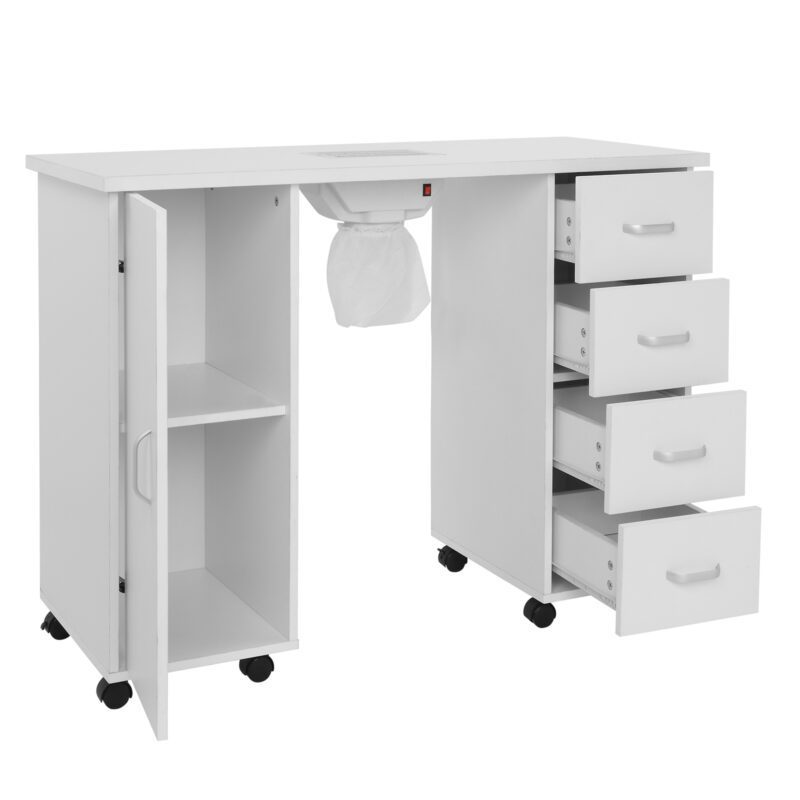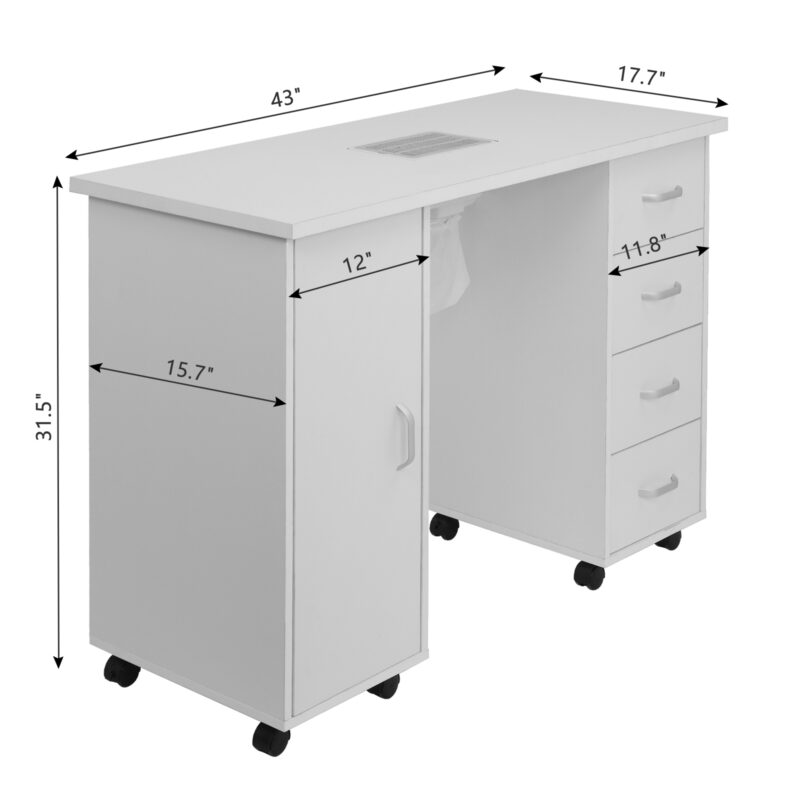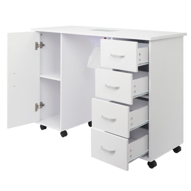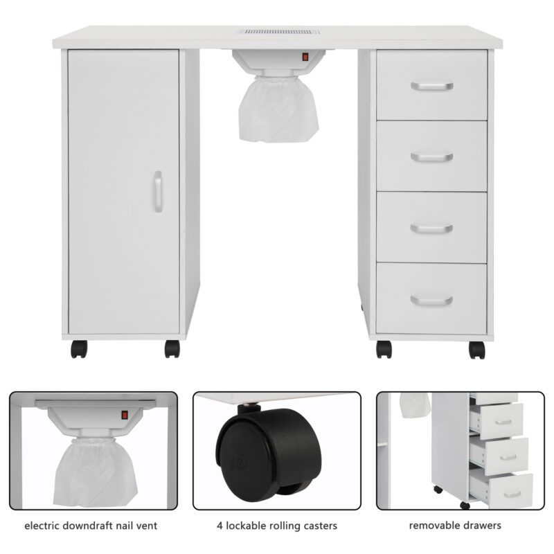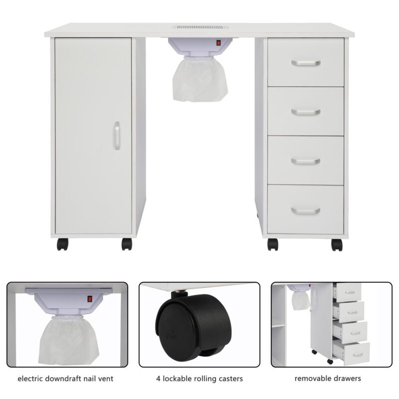 This professional nail table is made of high-quality density board, which is eco-friendly and durable. Suitable for beauty salons, manicure shops, nail technicians, spas, and more. Features a modern, sleek design with a locking cabinet holding 4 removable easy-clean drawers for secure storage of polishes, chemicals, and tools. Easy to install and maintain.