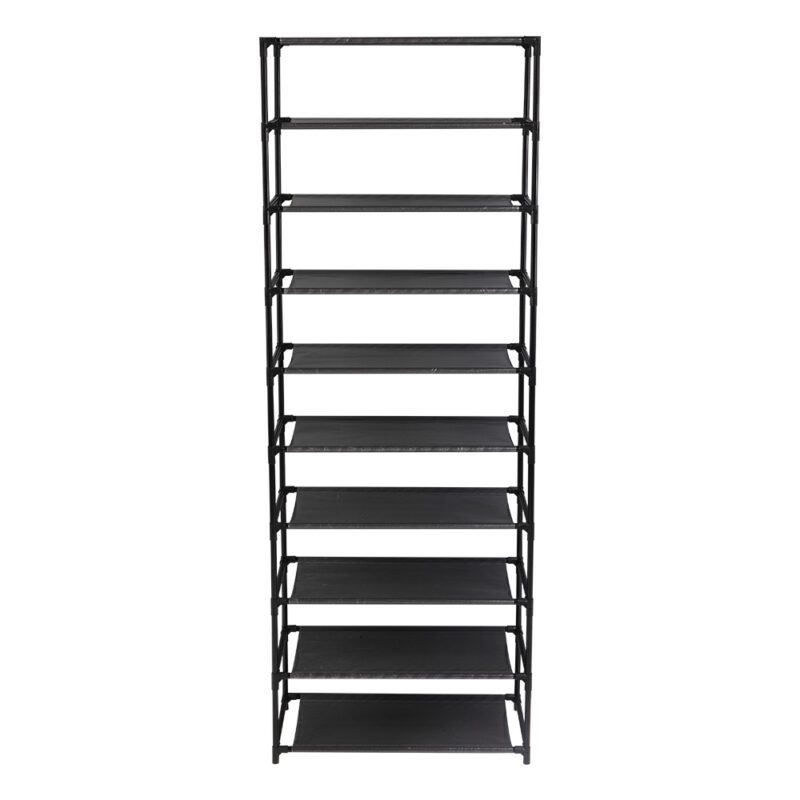 Organize your shoes efficiently with this 10-tier stackable shoe rack. Featuring a durable steel frame and non-woven fabric shelves, it provides sturdy storage for up to 30 pairs of shoes. The space-saving design includes handles for portability and requires simple assembly. Ideal for homes, dormitories, or offices.
