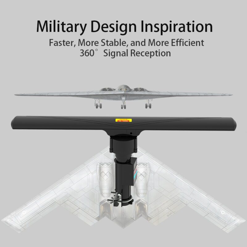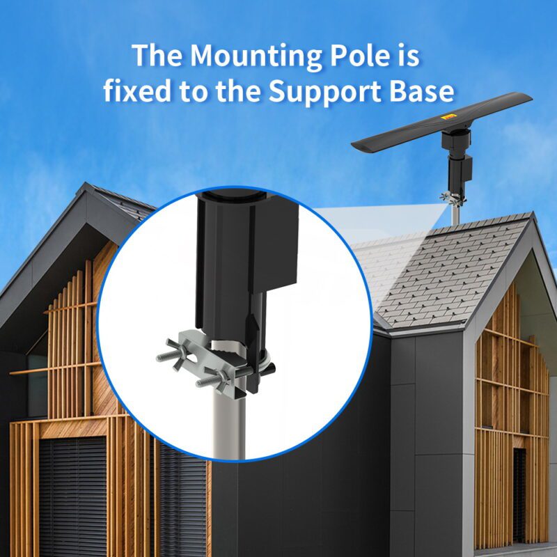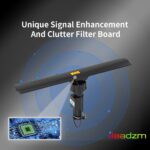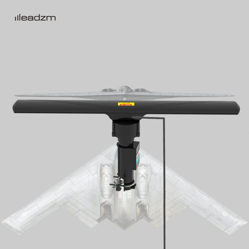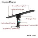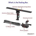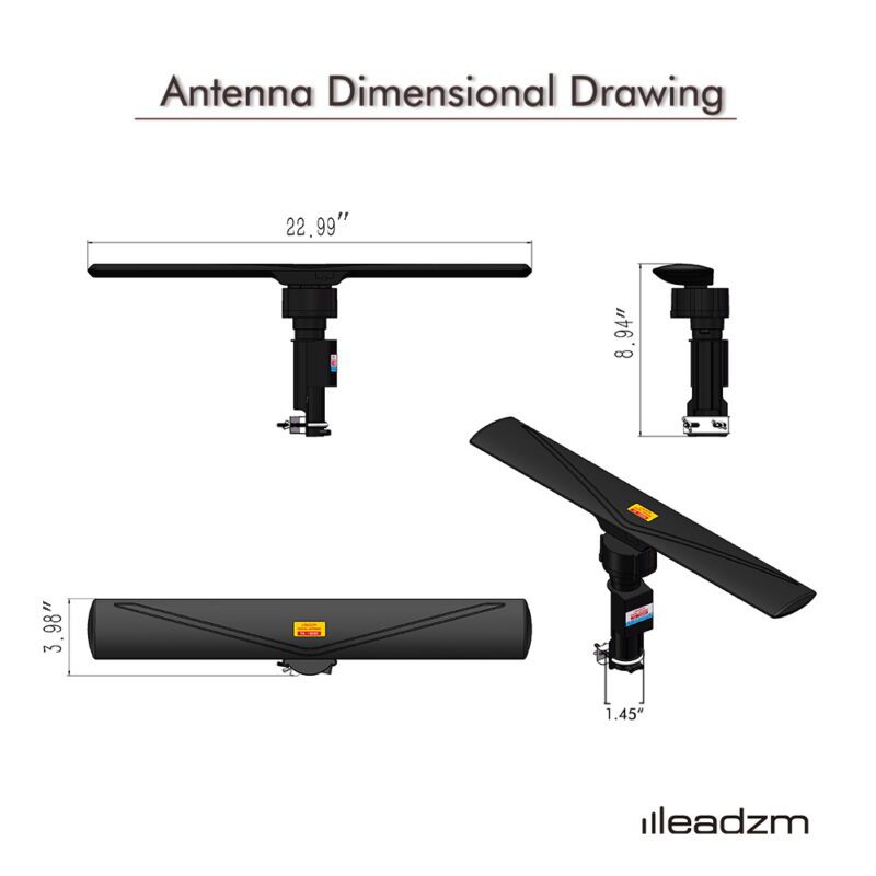 The Leadzm outdoor antenna provides dual-band VHF/UHF reception for television signals in the 40-860MHz frequency range. Featuring 20±3dB gain and 350° rotation capability, it offers enhanced signal optimization. Constructed with durable, weather-resistant materials, this compact black antenna includes a mounting bracket with 40ft coaxial cable, amplifier power supply, and remote control for convenient installation.