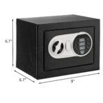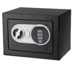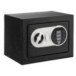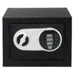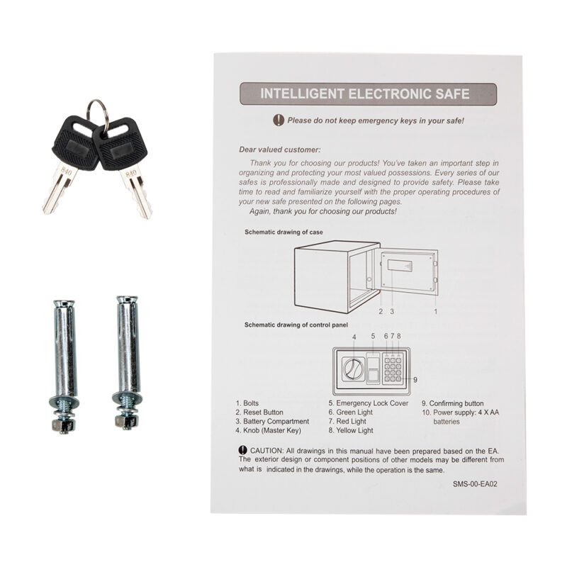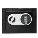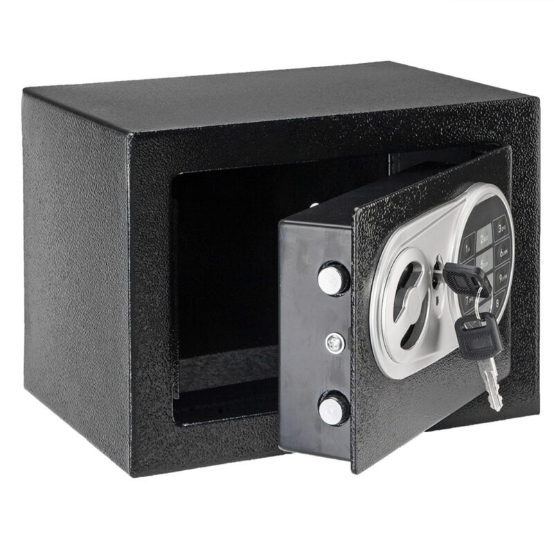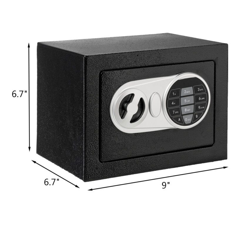 Securely store cash and valuables with the 17E Home Electronic Password Safe Box. Made of durable steel plate, this safe features electronic password access with reset capability and memory function during battery changes. Compact design fits easily in homes or offices. Includes emergency keys and mounting hardware.