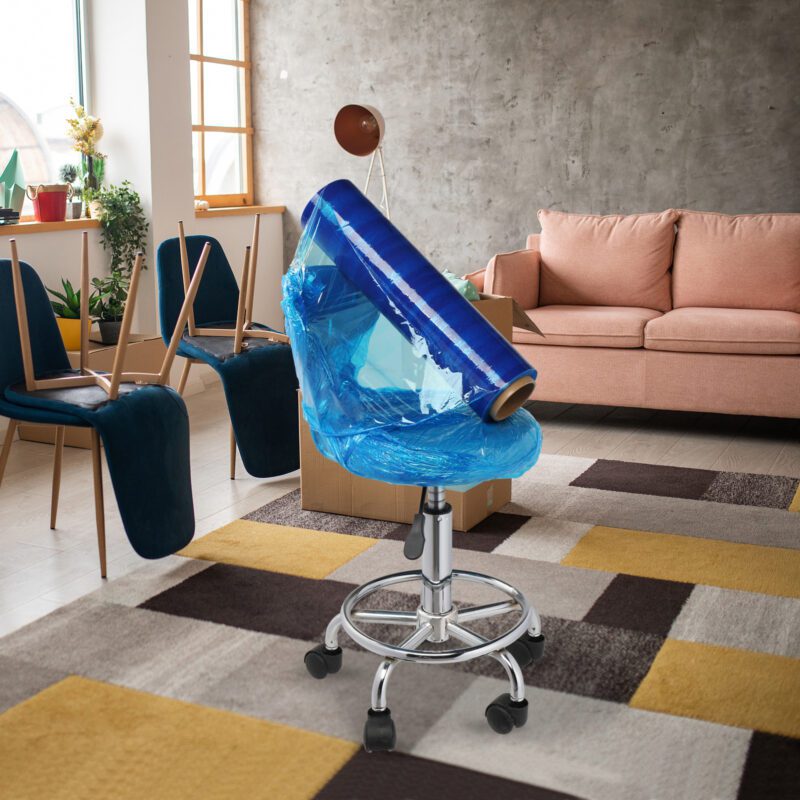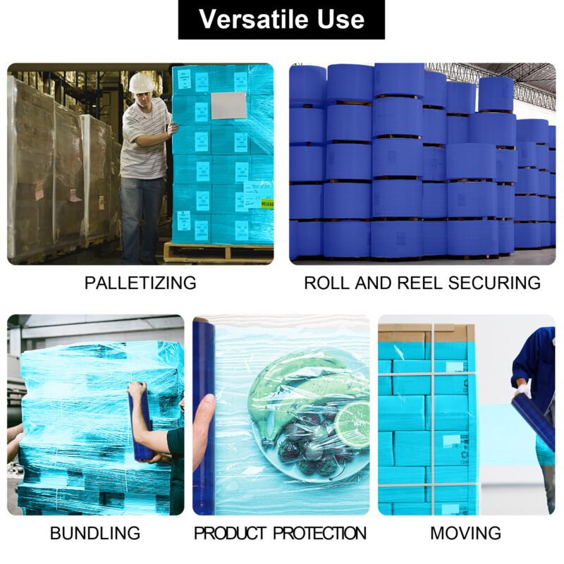 This blue cast hand stretch film securely bundles and protects items during moving or storage. The self-adhering film clings to itself without needing tape or heat sealing, resisting punctures and tears while safeguarding against dust, dirt, and moisture. Easily removable with no residue. Features quiet unwind, high clarity, easy release, 3-inch core diameter, and one-side cling to prevent packages from sticking together. Non-transparent blue finish conceals package contents. Package includes 4 rolls.