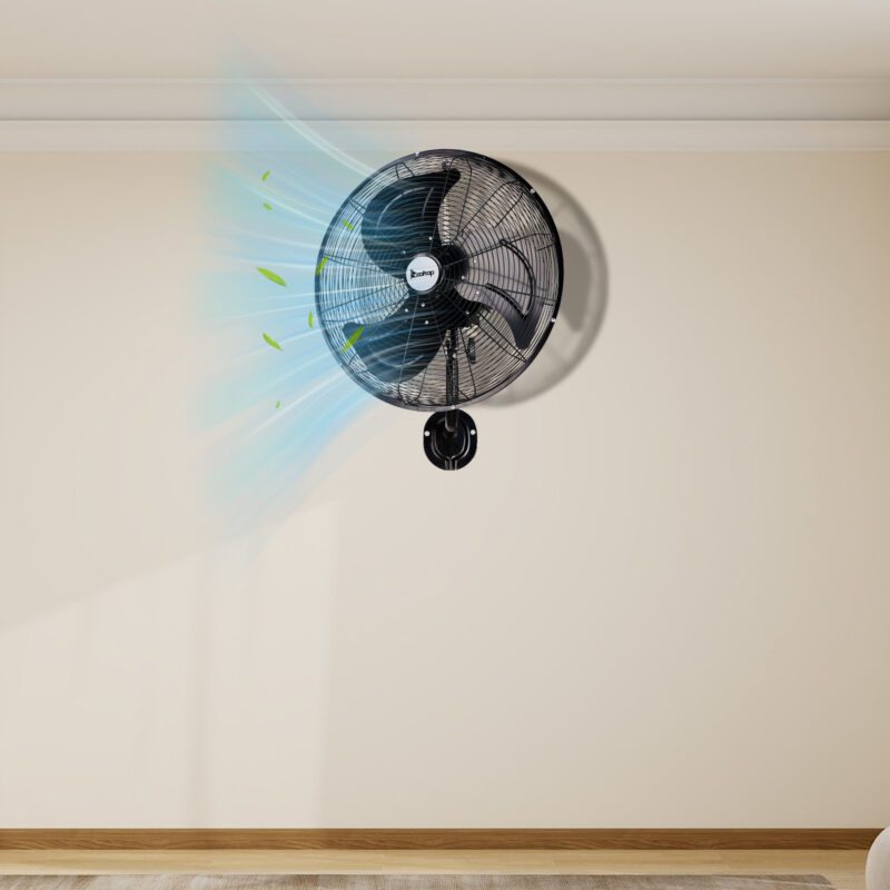 This 18-inch industrial wall mount fan features wide-angle oscillation to effectively circulate air in large spaces. With a maximum airflow of 4592 CFM and durable all-metal construction, it provides powerful ventilation for commercial, garage, workshop, and residential use. Key features include 60-70 degree horizontal oscillation, 45-degree vertical tilt adjustment, three speed settings (3175/3882/4592 CFM), and powder-coated steel housing for corrosion resistance. Easy to install with included mounting hardware, this fan saves floor space while delivering robust airflow. Ideal for warehouses, gyms, basements, and greenhouses. Specifications: 100W copper motor, aluminum blades, 110V/60Hz, 60-70 dB noise level, 13.67 lb weight. Package includes fan, installation hardware, and user manual.