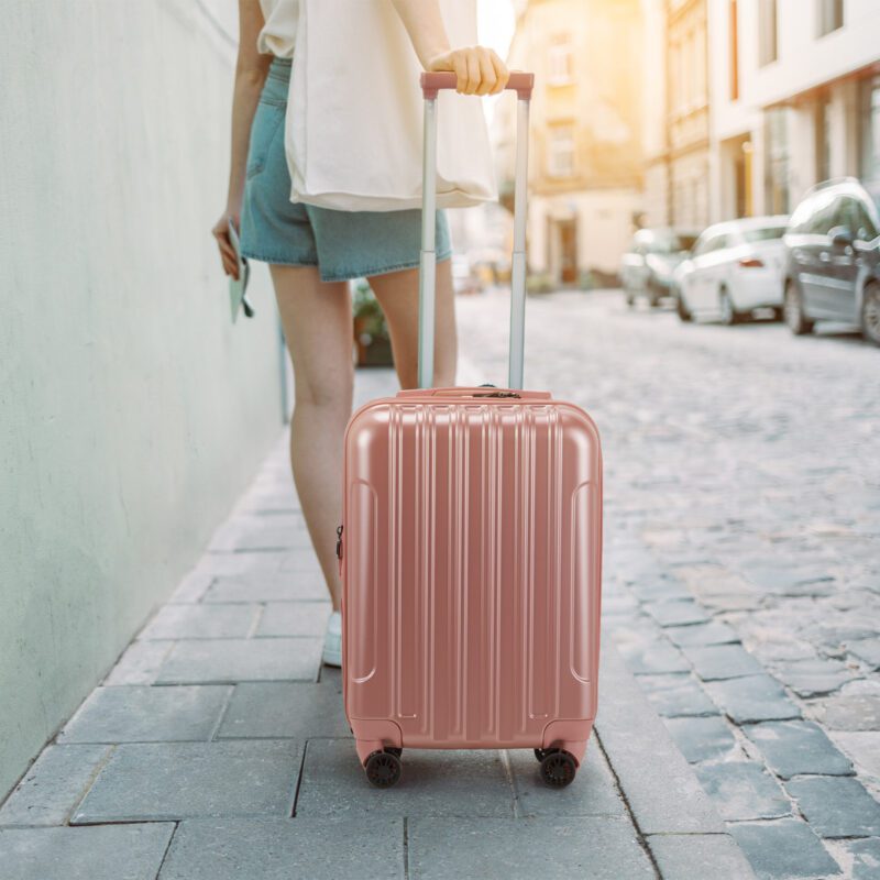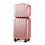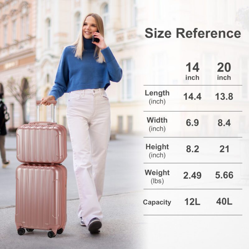 This Ross Gold 2-piece hardside luggage set includes a 20-inch expandable carry-on suitcase and 14-inch cosmetic case, ideal for personal or business travel. Made of lightweight, durable PC+ABS material with an impact-resistant shell, the carry-on meets most airline size requirements. Features include a TSA-approved mechanical lock, smooth-rolling 360-degree spinner wheels for easy maneuverability, telescopic 3-step adjustable handle, cushioned top/side handles, and protective bumper feet. The carry-on expands to provide 20% additional capacity. Includes: 20″ carry-on (15.7″ x 7.6″ x 22.2″, 6.17 lbs) and 14″ cosmetic case (13″ x 11.4″ x 6.7″, 2.2 lbs).