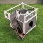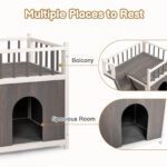 Provide a comfortable shelter for cats and dogs with this 2-story wooden pet house. Designed for outdoor and indoor use, it features stairs, a balcony, and a rest room. Made from natural fir wood for durability. Grey and white color scheme adds style to any space.