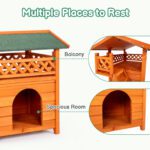 This 2-story wooden cat house provides a safe shelter for cats indoors or outdoors. Featuring a weatherproof asphalt roof for protection and eco-friendly fir wood construction, it offers durability. The multi-level design includes a balcony, enclosed rest room with door, and side stairs for climbing. Vibrant orange and green colors add visual appeal. Dimensions: 30.3 x 19.3 x 29.1 inches (77 x 49 x 74 cm). Weight: 23.1 lbs (10.5 kg).
