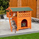 2-Story Wooden Cat House with Stairs & Weatherproof Roof – Orange&Green