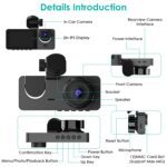 Monitor your vehicle comprehensively with this 3-channel dash cam featuring 1080P front (170°), in-car (150°), and rear (150°) cameras. Records road conditions, cabin activity, and rear views simultaneously. Built-in G-sensor locks collision footage automatically, while motion detection activates recording during movement. Parking monitor safeguards your vehicle when parked. Includes 32GB MMC card (supports 64GB) with loop recording that overwrites oldest files. Easy windshield installation maintains clear visibility.