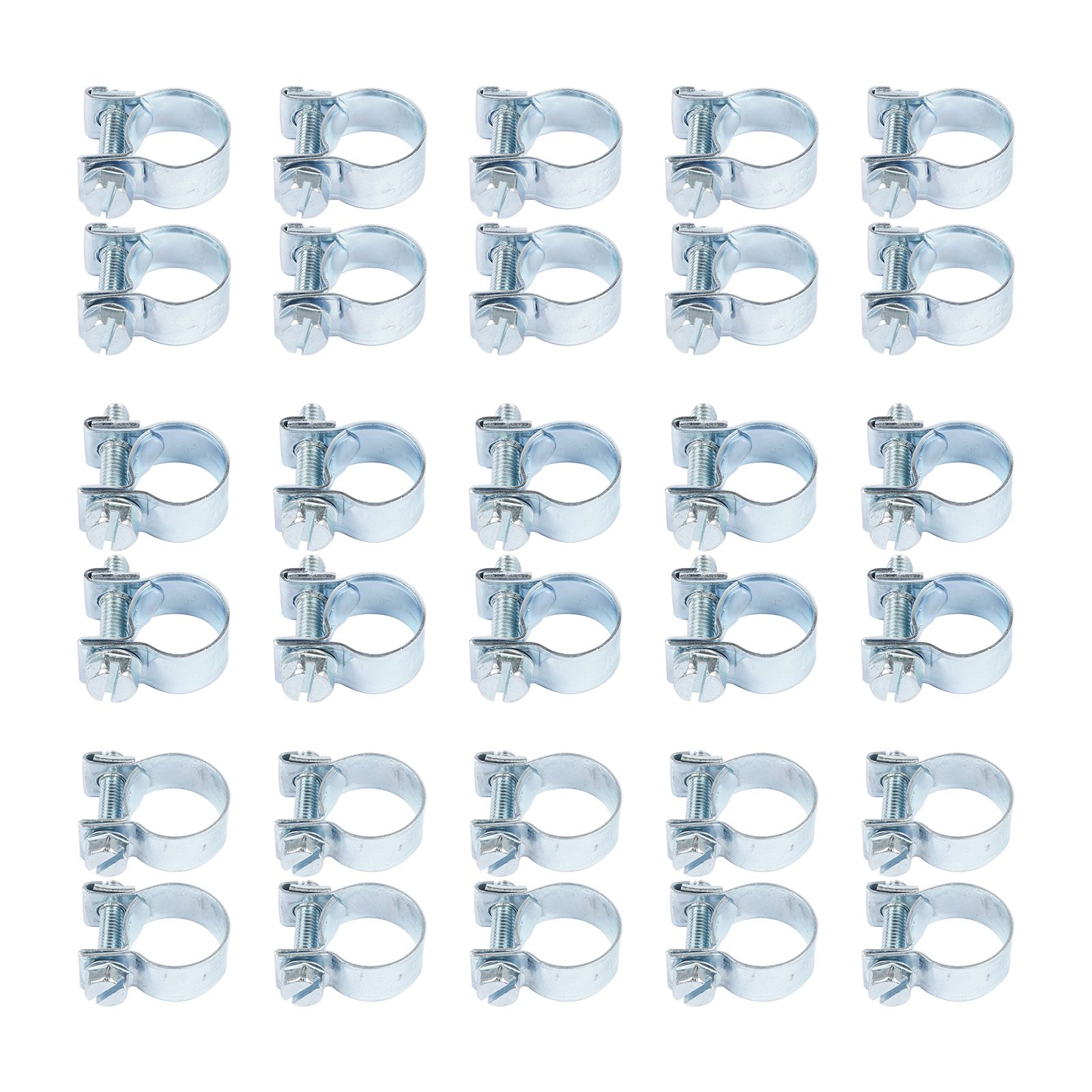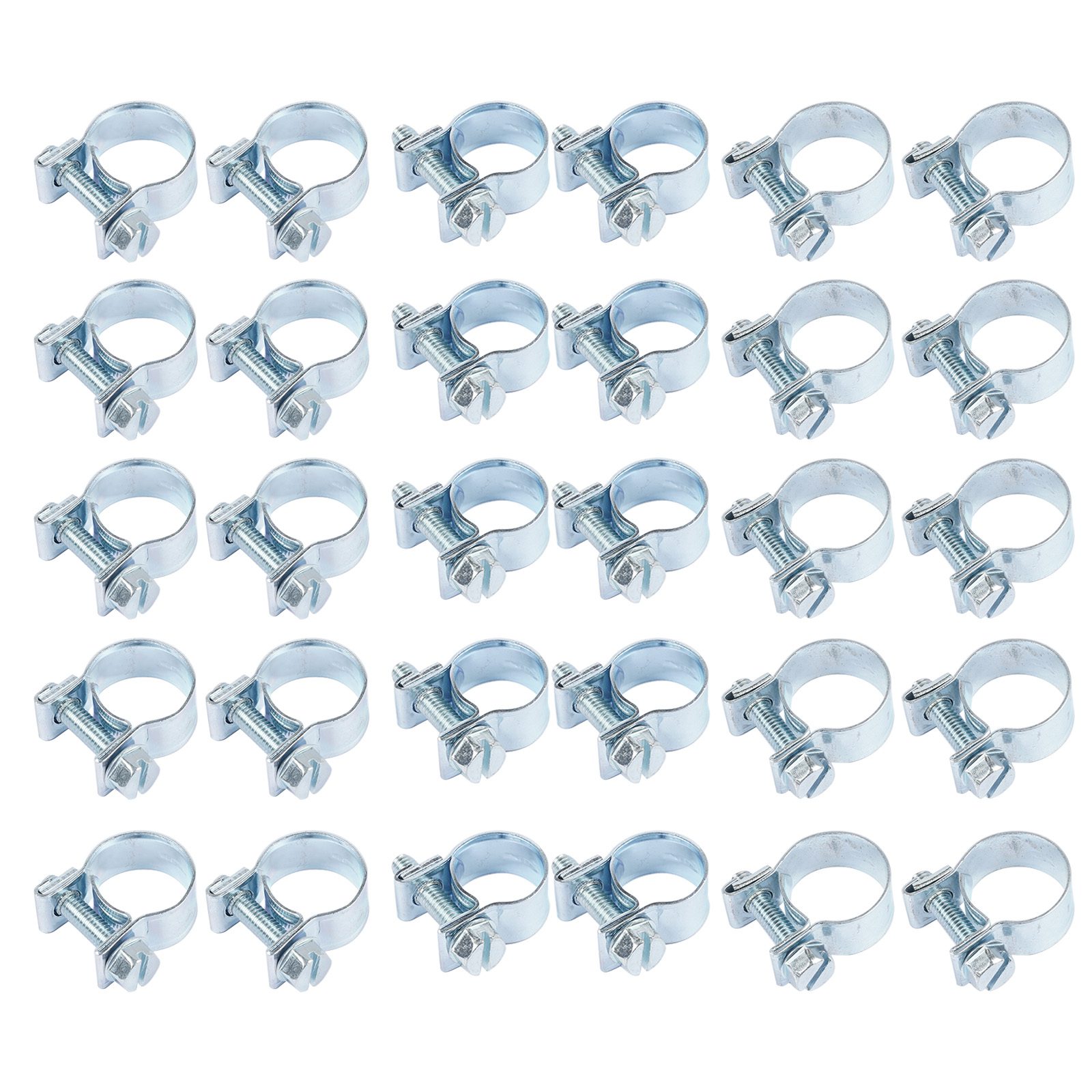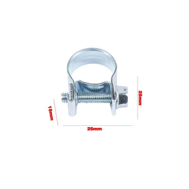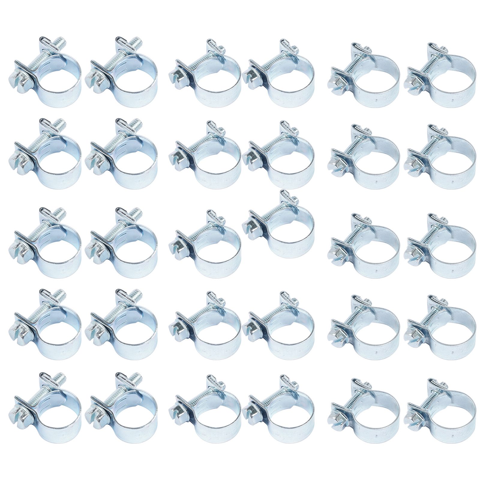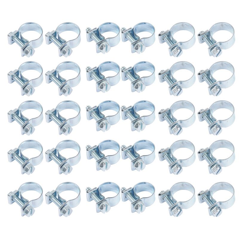 Set of 30 adjustable automotive hose clamps for fuel injection systems. Package includes: 10 clamps for 1/4″ (11-13mm) hoses, 10 for 5/16″ (13-15mm) hoses, and 10 for 3/8″ (14-16mm) hoses. Securely fasten fuel lines and tubing connections.