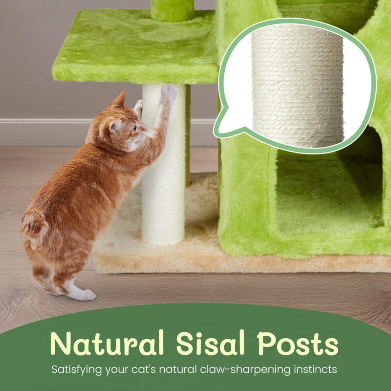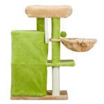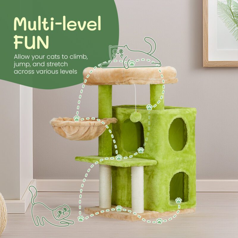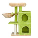 Give your feline friends a comfortable place to play, relax, and scratch with our 33 inch Cat Tree. Designed for indoor cats, this activity center features multiple napping spots, climbing opportunities, and scratching surfaces to keep your cats entertained. The yellow and green design adds vibrant style to your home decor. Includes an 18×18 inch padded perch with supportive edges, a plush velvet hammock, two spacious condos, and sisal-wrapped scratching posts. Durable MDF construction with reinforced base ensures stability. Dimensions: 33.5x23x16.5 inches (85×58.5×42 cm). Weight: 10.7 lbs (4.85 kg).