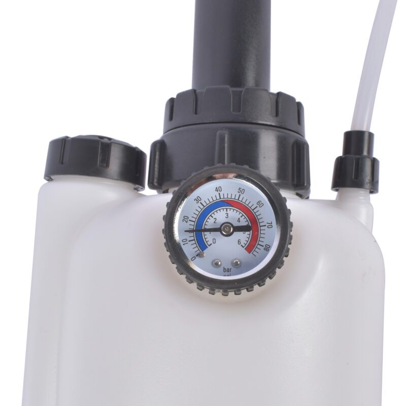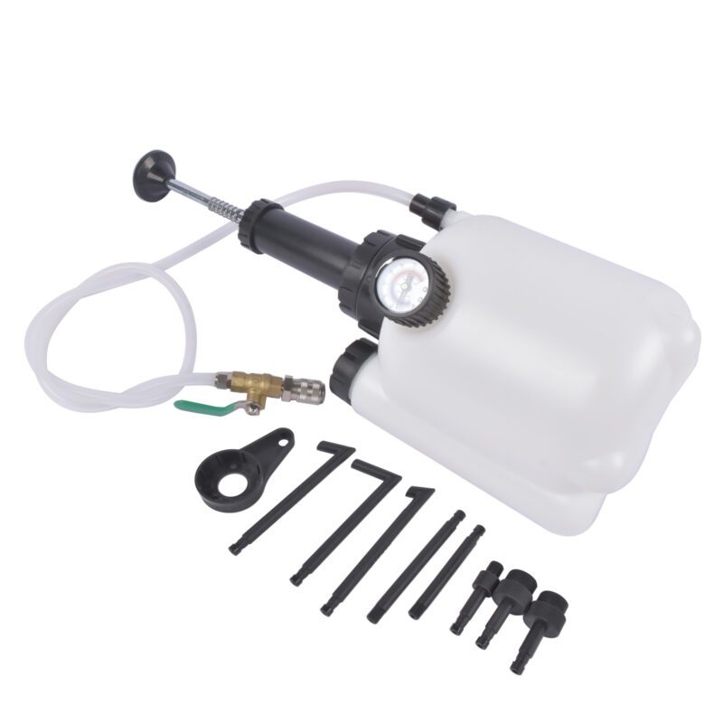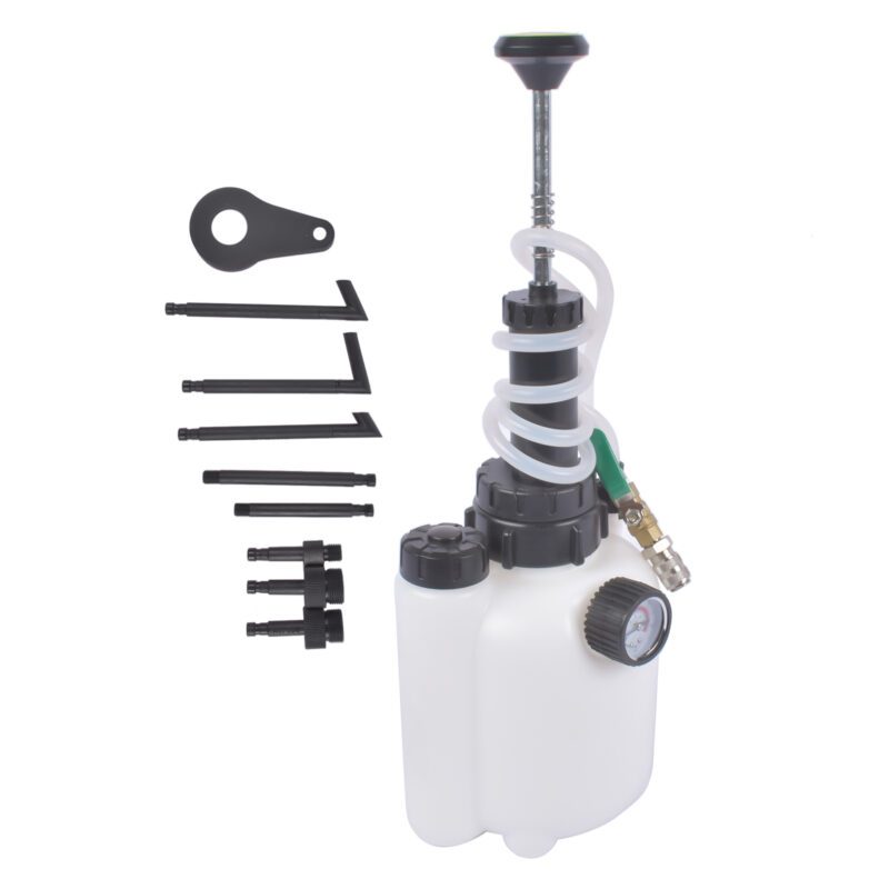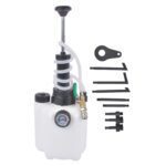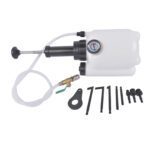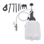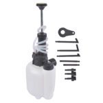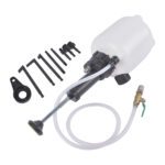 This manual transmission fluid pump system is constructed of premium materials for durability. The kit includes a 3-liter fluid container with pump handle lid, pressure gauge, pressure-release cap, tube, and 8 transmission fluid adapters (ATF101, ATF102, ATF103, ATF104, ATF105, ATF106, ATF107, ATF109) compatible with common automatic transmission models for Ford, BMW, Honda, Nissan, VW, Porsche, Mini Cooper, Audi, and Mercedes vehicles. Specifications: Condition: Brand New; Color: White; Pressure: 0-85 PSI (0-6 bar); Capacity: 3L. Features: Suitable for pressurized fills of engine coolant, motor oil, brake fluid, or power steering fluid. When used with an air compressor, efficiently extracts fluids. Includes hose connection port for various adapter sizes. Instructions: Fill container via funnel, connect hose, select appropriate adapter for transmission, and pump fluid using ergonomic handle while monitoring pressure gauge. Package includes all listed components plus wrench.