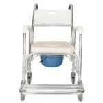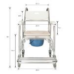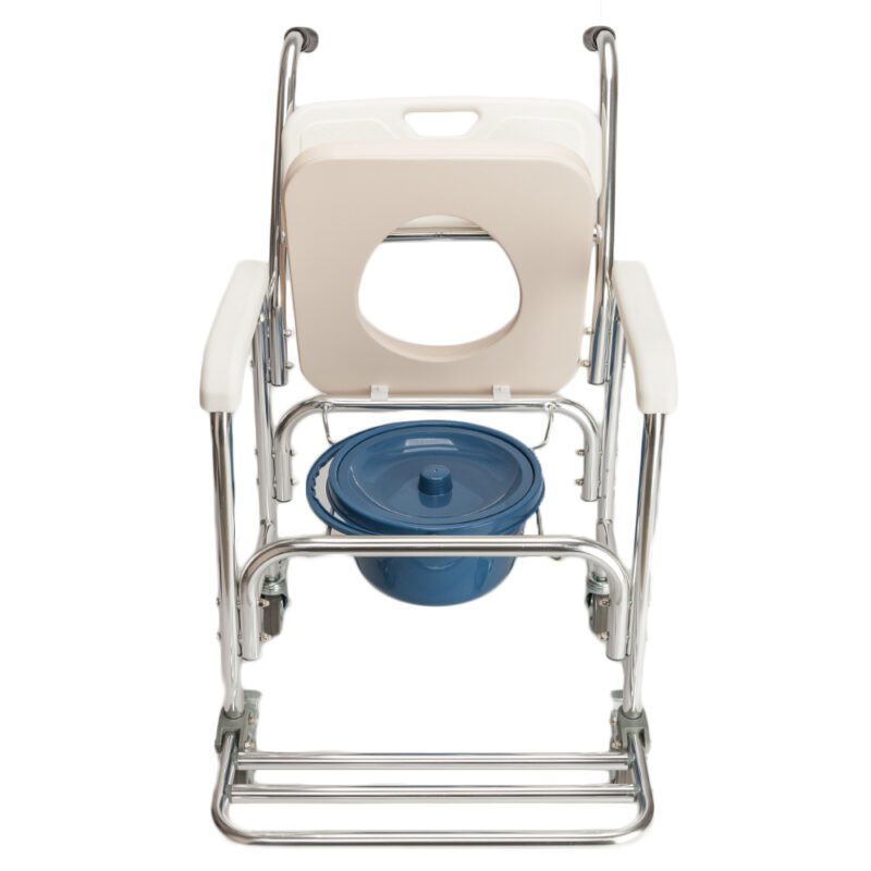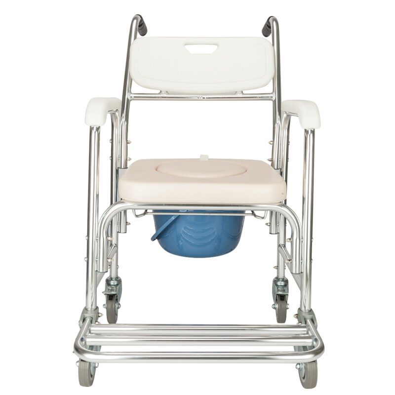 This multifunctional commode chair provides safe, convenient toileting and bathing support for elderly, disabled, and pregnant individuals. It functions as a commode chair, wheelchair, and bath chair with a durable aluminum frame supporting 300 lbs. Features include waterproof anti-mold construction, non-toxic PE backrest for comfort, textured seat design, water-resistant memory foam cushion, anti-slip handles, and four lockable wheels. Galvanized steel components resist rust, while retractable pedals enhance accessibility.