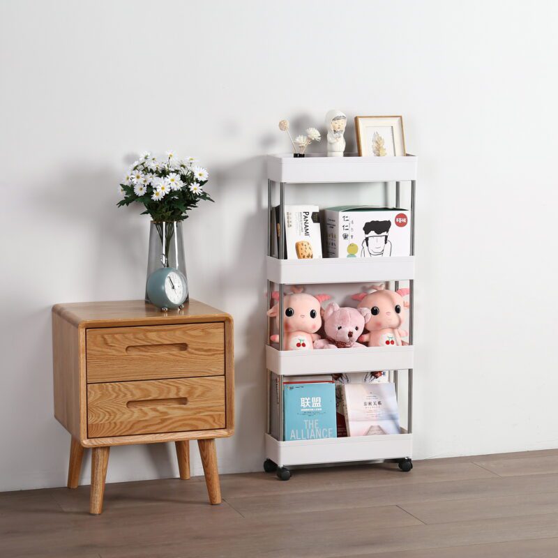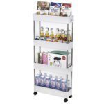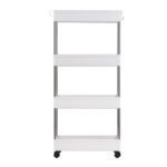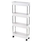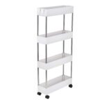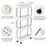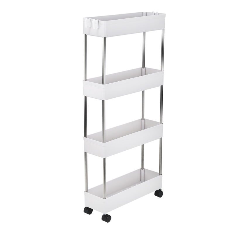 This multi-functional storage cart features a slim 4-layer design for narrow spaces like kitchens, bathrooms, and laundry rooms. Constructed from durable plastic and stainless steel, it includes four smooth-rolling wheels for easy mobility. The compact structure maximizes storage capacity while fitting seamlessly between appliances or in closets. Additional top hooks provide extra hanging space for organization.