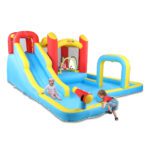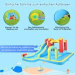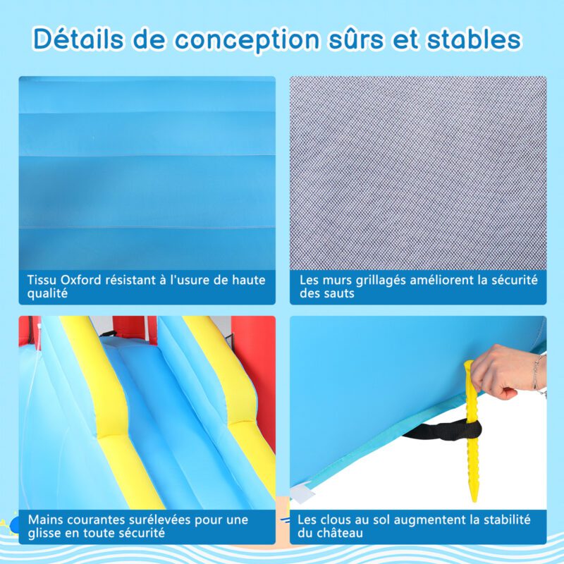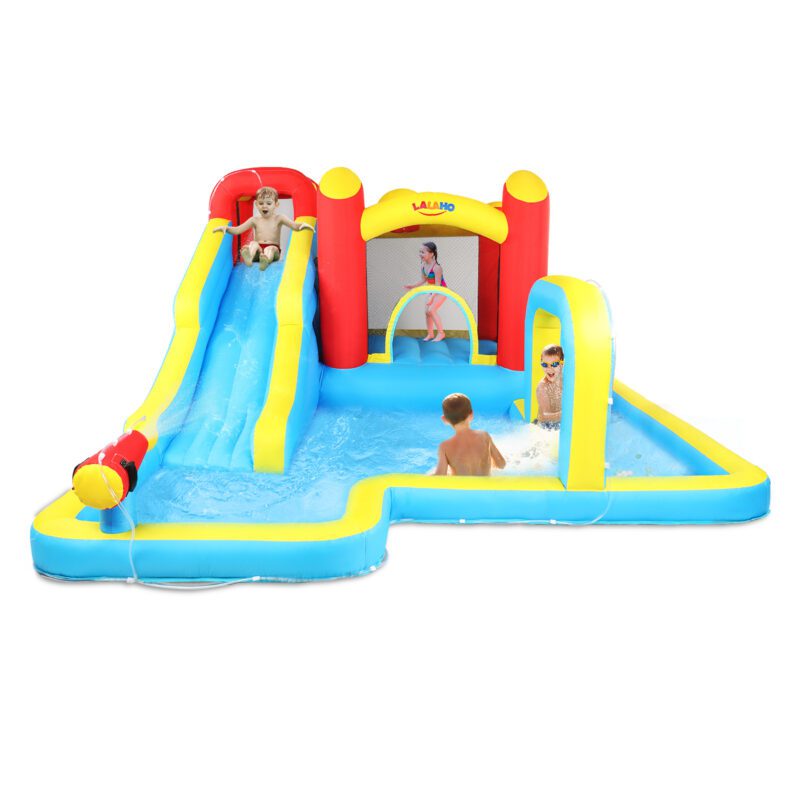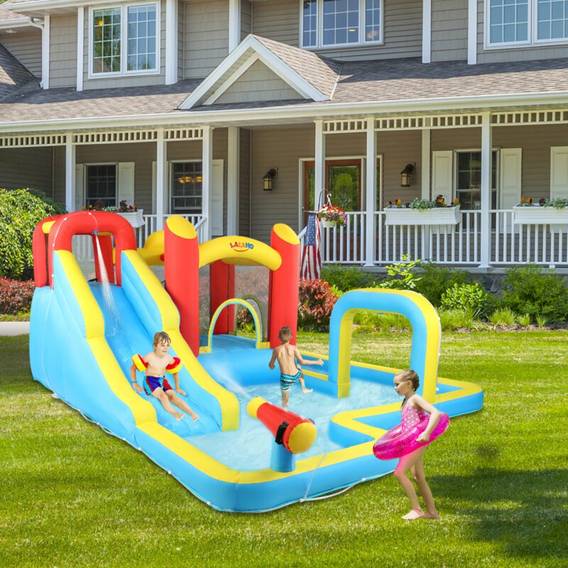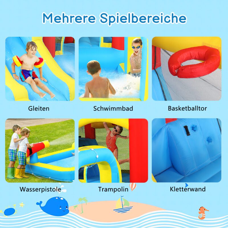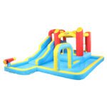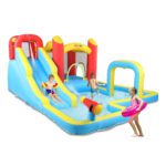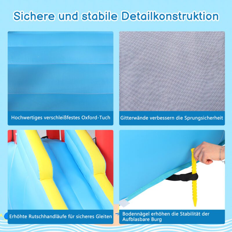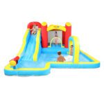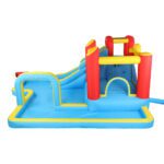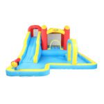 This durable inflatable castle features a slide, pool, and trampoline in a vibrant red, yellow, and blue color scheme. Made from 420D/840D Oxford fabric for lasting performance. Ideal for outdoor play, parties, and family gatherings. Easy to set up and store.