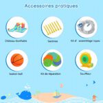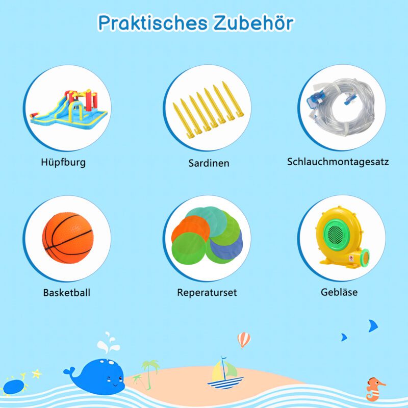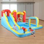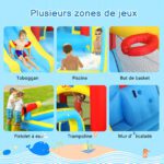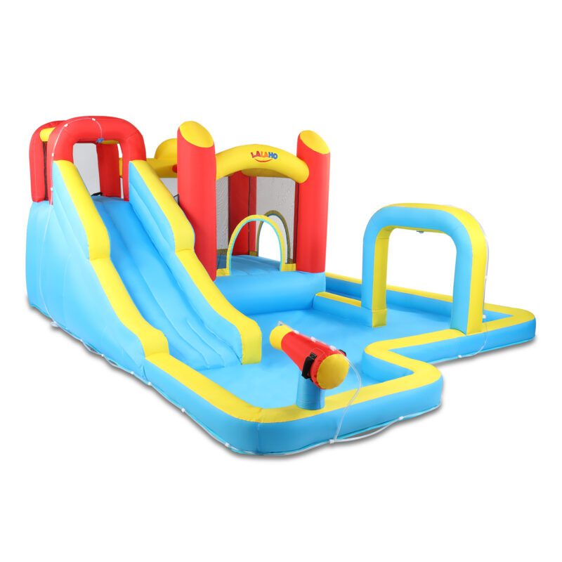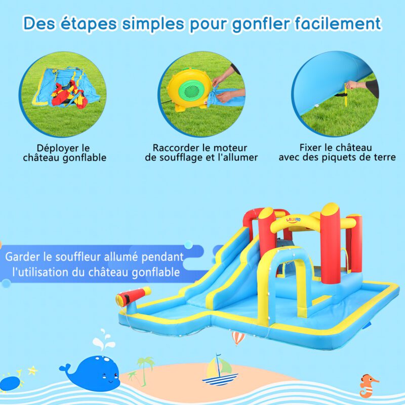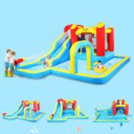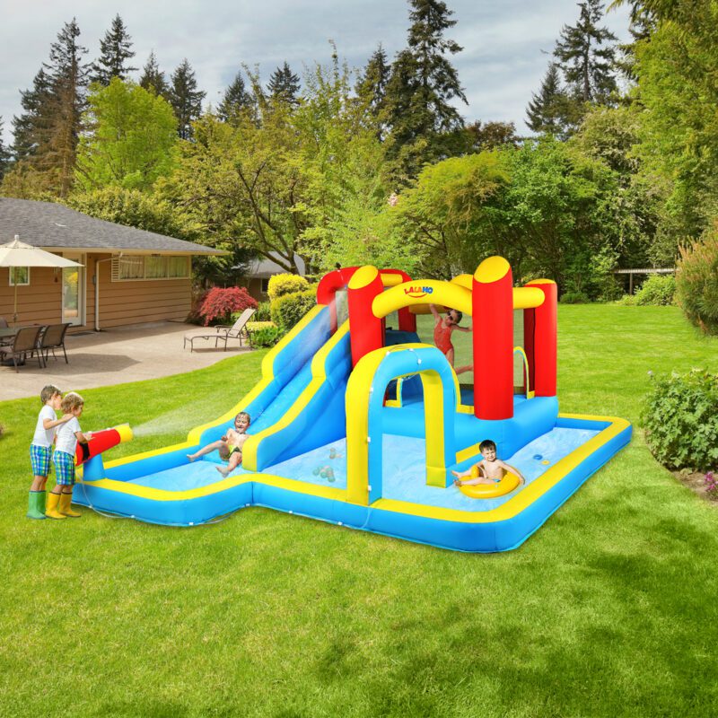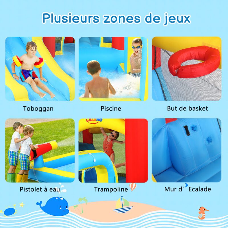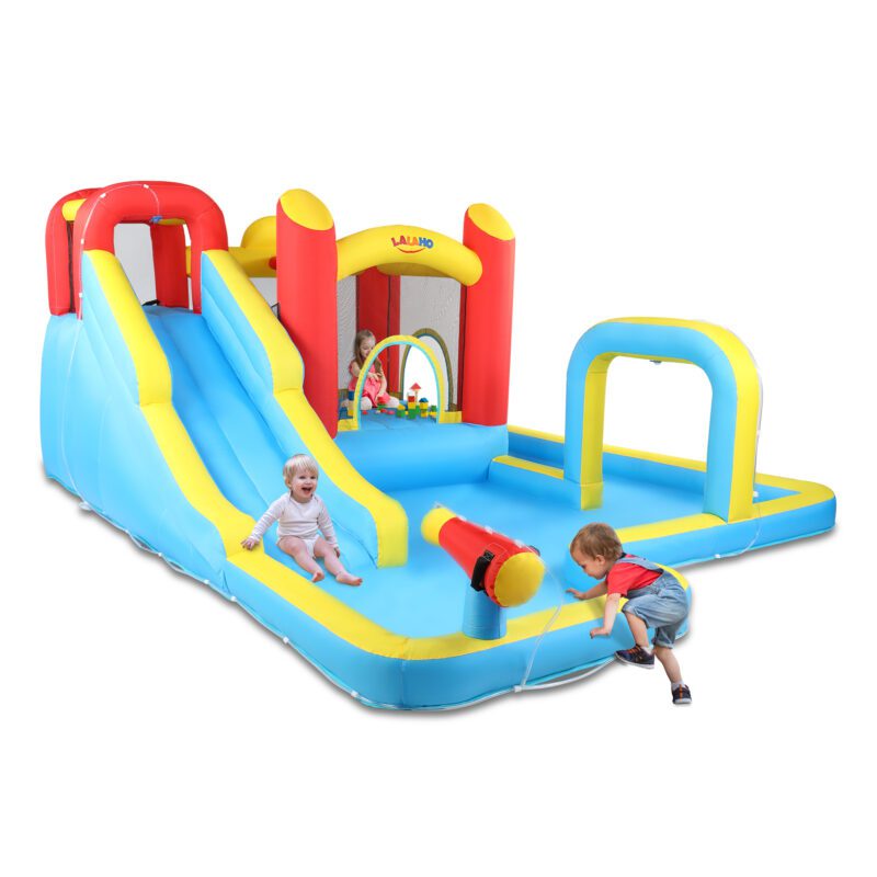This durable inflatable castle features a slide, pool, and trampoline in a vibrant red, yellow, and blue color scheme. Made from 420D/840D Oxford fabric for lasting performance. Ideal for outdoor play, parties, and family gatherings. Easy to set up and store.
