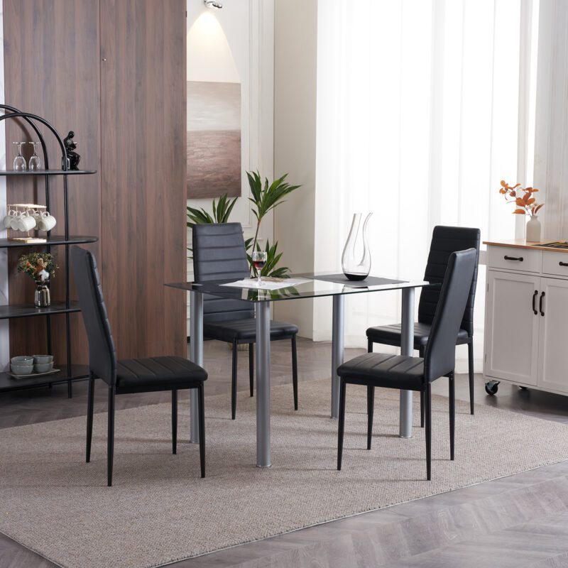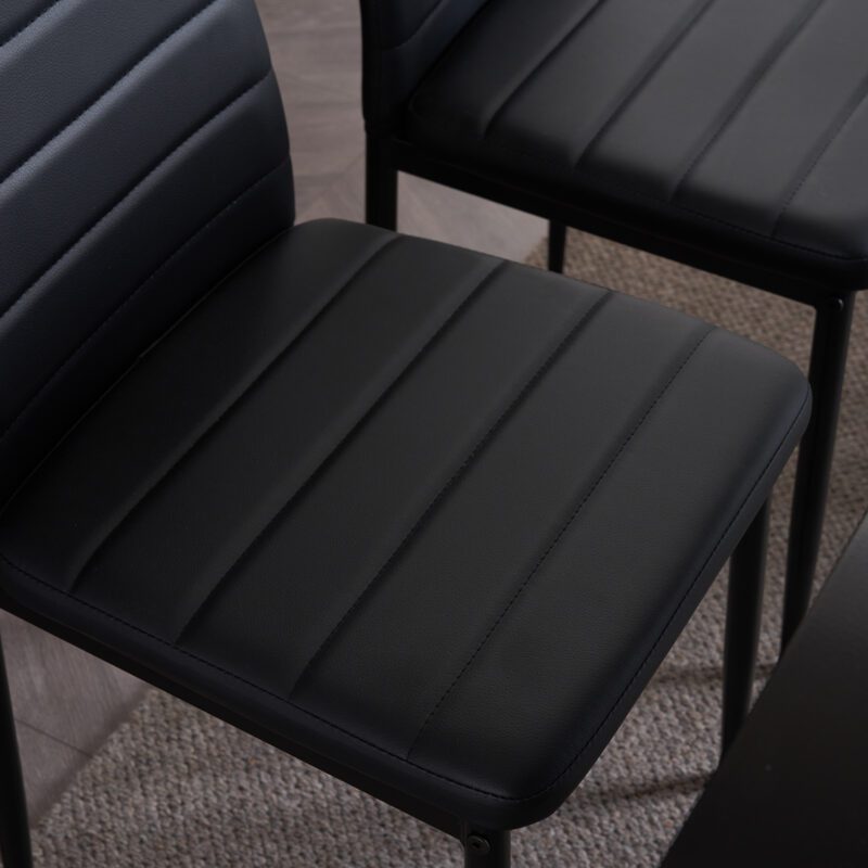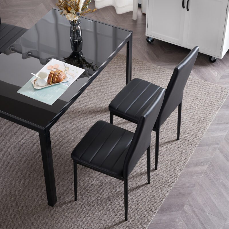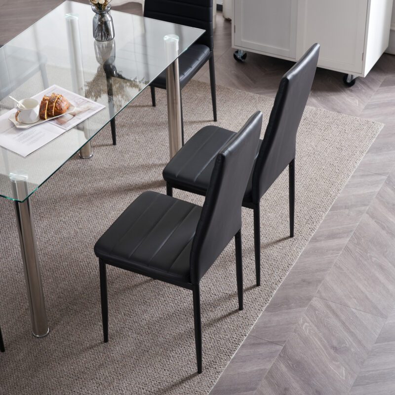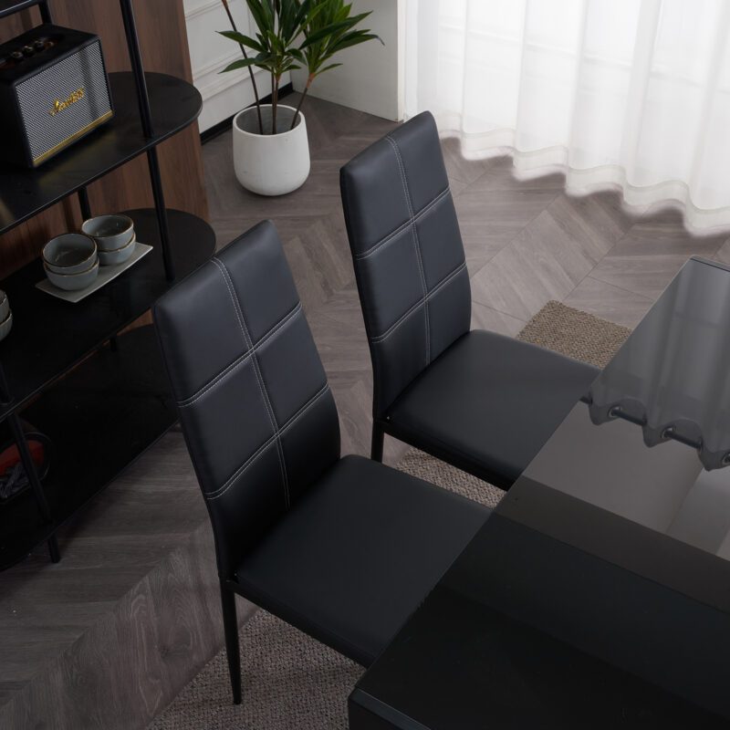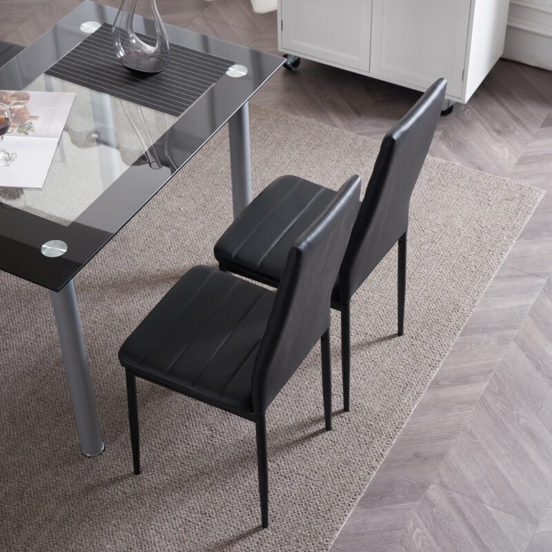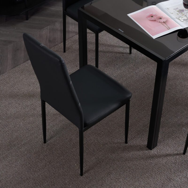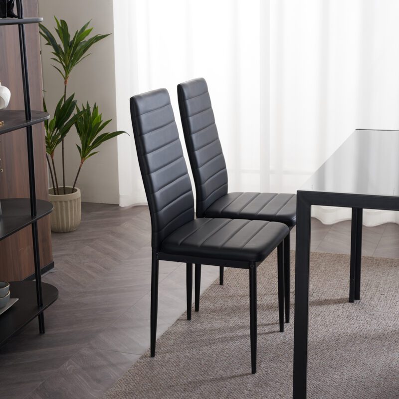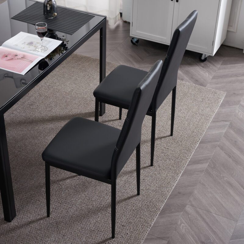 Create an elegant dining space with this set of 4 black dining chairs. Featuring soft PU leather upholstery, these chairs combine durability with comfort. The waterproof, stain-resistant surface ensures easy maintenance, while the high-density foam cushion and ergonomic high-back design provide lasting support. Simple styling complements various table designs. Sturdy iron tube frames offer reliable stability with a 120kg weight capacity. Includes assembly tools for straightforward setup.