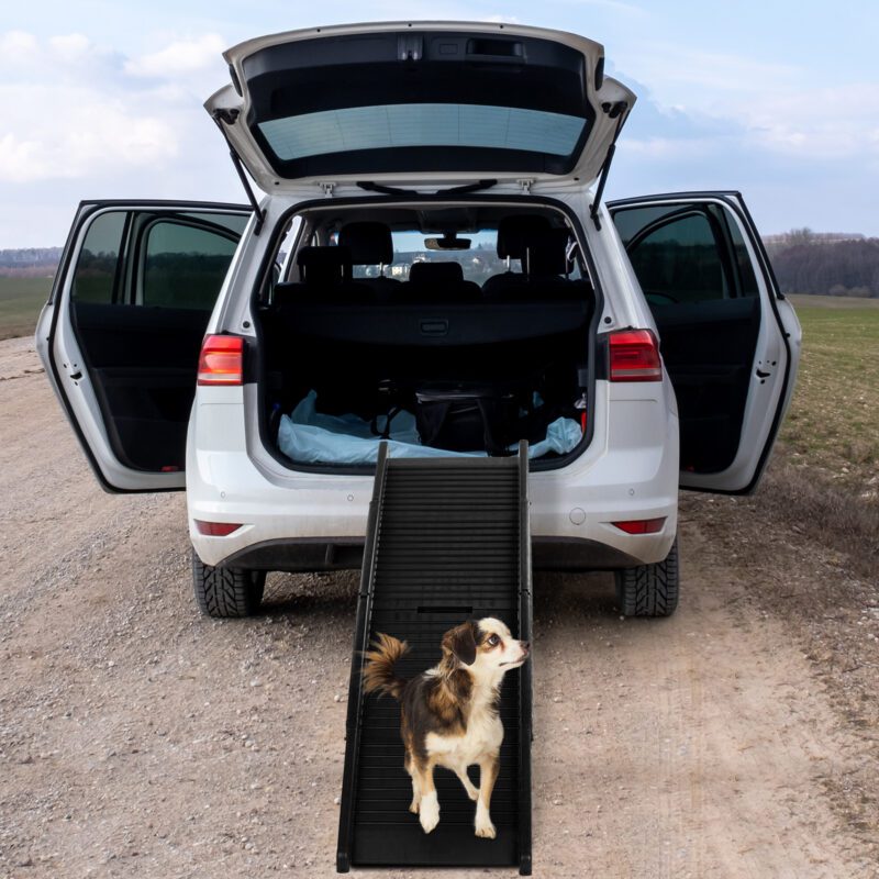 Introduction: Make every journey easier for your furry friend with our Folding Dog Ramp. Designed for convenience, this tri-fold ramp helps your pet get in and out of cars, trucks, and SUVs effortlessly. Its compact design ensures easy storage and portability, ideal for on-the-go pet owners. Lightweight and durable, this ramp offers a safe solution for helping your pet access vehicles and home furniture.
