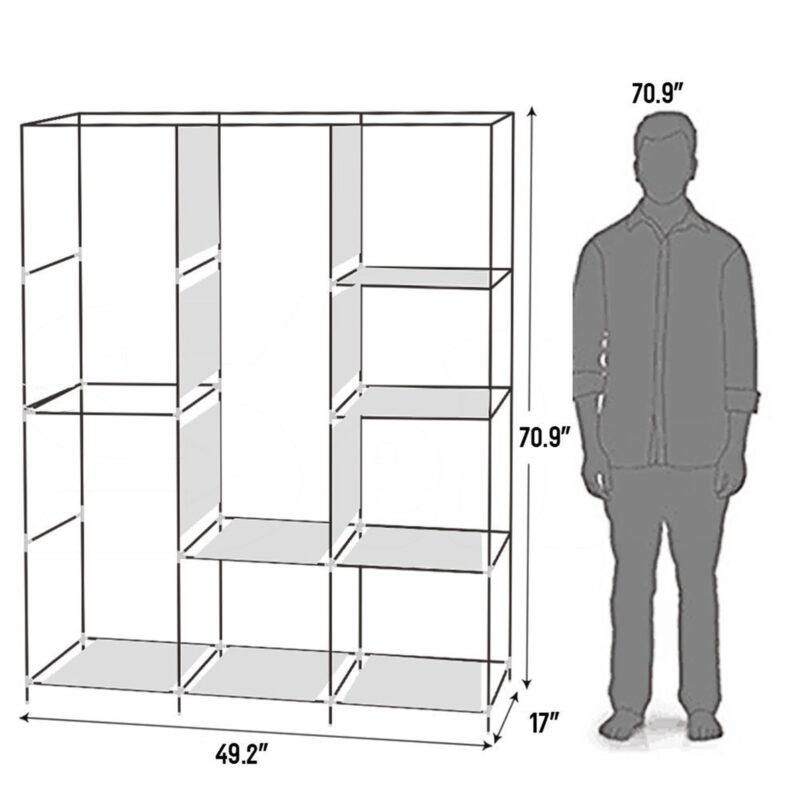 This 71-inch portable wardrobe closet offers organized storage for small spaces. Constructed with durable non-woven fabric, steel tubes, and plastic connectors, it features a zippered dustproof cover and waterproof tiers for easy cleaning. The movable clothes hanging rod and 8 shelves provide versatile storage for both hanging garments and folded items. Space-saving dimensions (49.2”W x 17”D x 70.9”H) make it ideal for compact rooms or walk-in closets. Simple tool-free assembly.