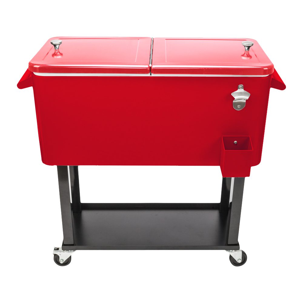 This durable 80Qt freezer incubator features a red box and black square foot tube design with a drain pipe. Constructed from high-quality iron and plastic materials, it offers stability and environmental safety. Equipped with two swivel wheels for mobility and a bottom storage tray. Provides dual functions: maintains warm food above 40°C for 4-5 hours and preserves cool temperatures for up to 48 hours using ice sheets. Features concise design and quality craftsmanship.