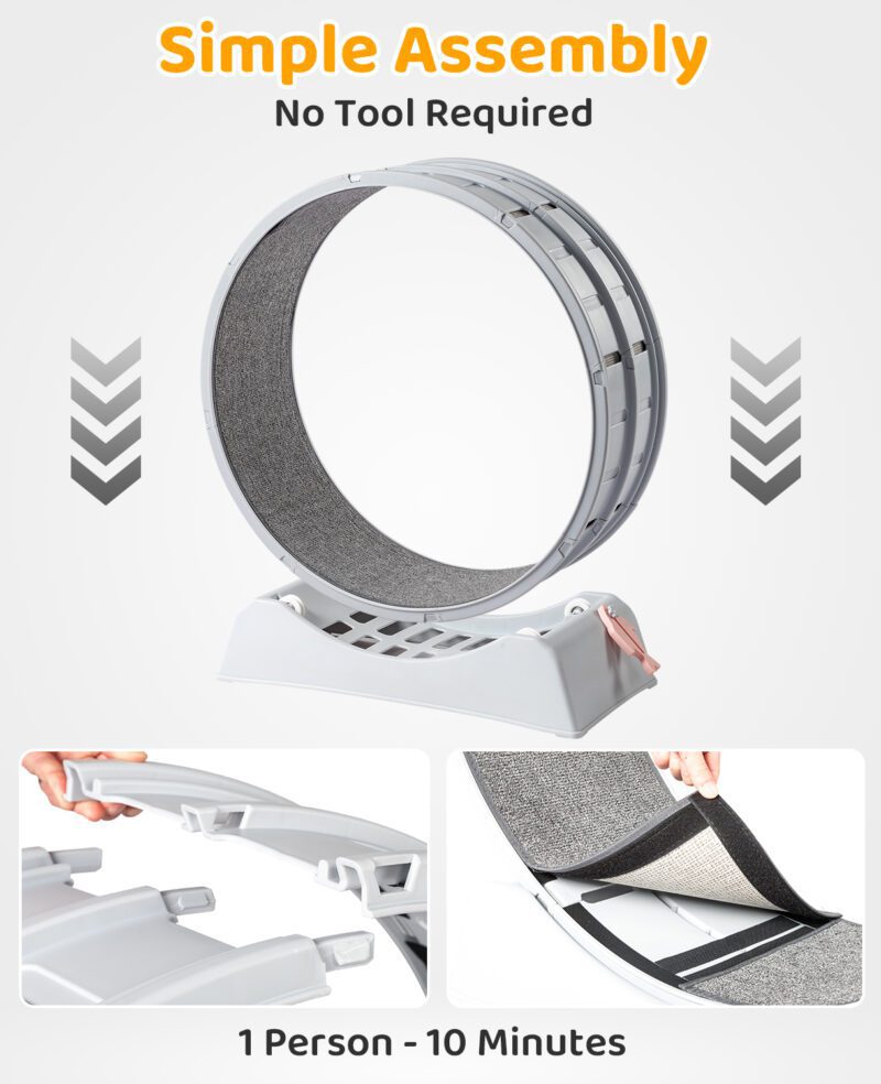 Help keep your cat active and entertained with this 31-inch Cat Exercise Wheel. The indoor cat treadmill features a carpeted runway for comfortable running and scratching. Designed with silent rollers for quiet operation, it allows cats to burn energy without disrupting your home. Includes a safety lock for secure storage and tool-free snap-fit assembly. The stable base prevents tipping, while the removable scratch pad simplifies cleaning. Ideal for promoting feline exercise and well-being.