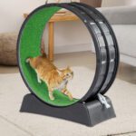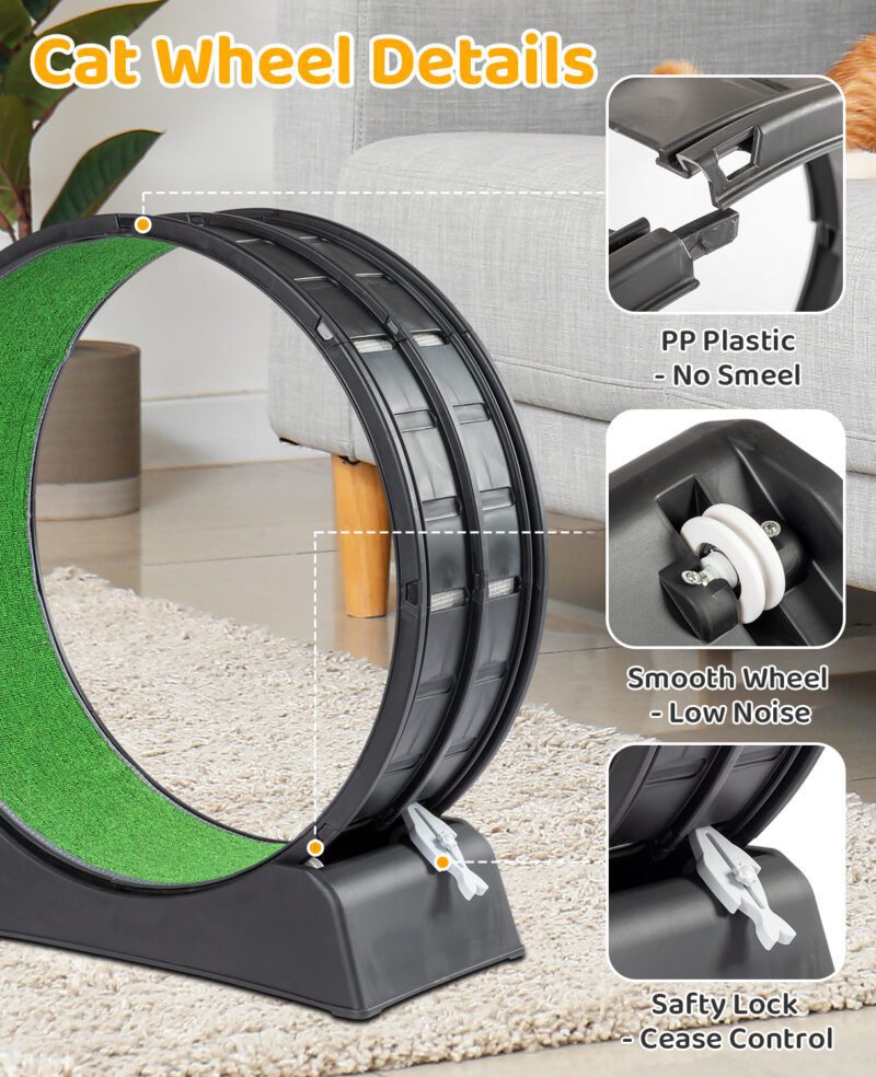 Keep your cat active and healthy with this 39.4-inch Cat Exercise Wheel. Designed for indoor cats, it features a carpeted runway for comfortable exercise and claw maintenance. The silent roller system ensures quiet operation, while the tool-free assembly and safety lock provide convenience and security. Sturdy construction with a widened base prevents tipping during use. Ideal for daily exercise and energy release.