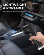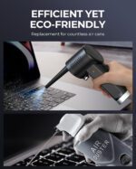 Experience high portability with this rechargeable electric air duster. Use it anywhere without power plugs—simply hold the base to activate 36000 RPM high-pressure airflow that effectively removes dust and debris. Eliminate disposable air cans with the 8000mAh battery and 10W fast charging (fully charged in 4 hours), providing up to 20 minutes of continuous runtime. The removable thin nozzle cleans hard-to-reach corners and tight spaces. Ideal for keyboards, computer cases, car seats, and LEGO toys. Ergonomic design ensures comfortable handling without cold cans. Features two modes: MANUAL for precise spot cleaning and AUTO for thorough continuous cleaning.