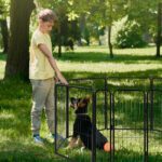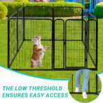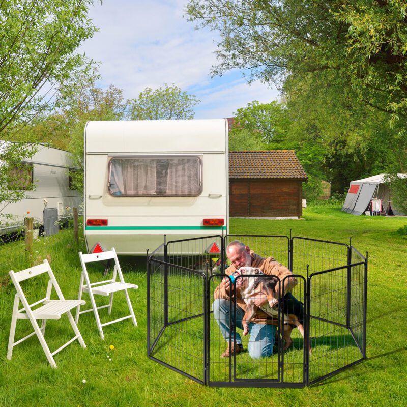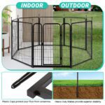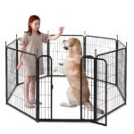 Provide a safe and spacious play area for your pets with this versatile 8-panel dog playpen. Made of heavy-duty, rust-resistant steel, this 32″ high fence features a convenient door and is ideal for both indoor and outdoor use. Easily customize the shape (rectangle, square, octagon) without tools, and connect multiple playpens for expanded space. Enjoy quick assembly and disassembly with no tools required. Perfect for travel, camping, RV trips, or your backyard, the portable, lightweight, and collapsible design includes ground stakes for stability.
