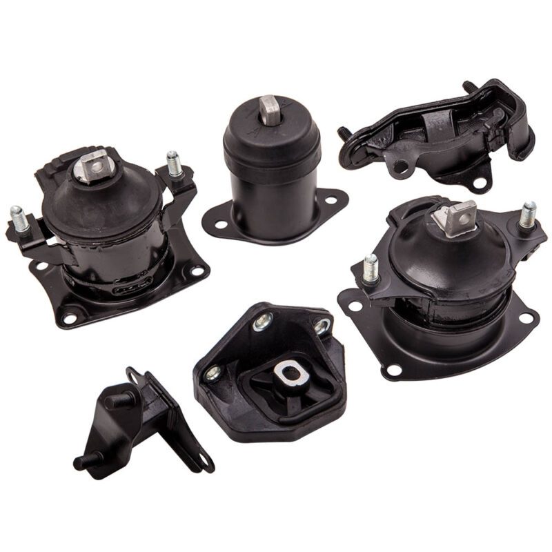 This 6-piece engine and transmission mount set is designed for Honda Accord and Acura TL models. It provides vibration reduction, noise control, and enhanced thermal resistance. Compatible with: 2003-2007 Honda Accord 3.0L Automatic (without sensor), 2004-2006 Acura TL 3.2L, and 2004-2008 Acura TL 3.5L. Includes 3 motor mounts and 3 transmission mounts matching OEM references: 9247, 9297, 9451, 9220, 9215, 9214. Features direct-fit installation, strict quality standards, and 2-year warranty against manufacturing defects. Professional installation recommended. California Prop 65 Warning applies.