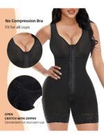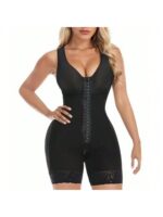 Comfortable wireless chest support provides shaping without tightness, with high-elastic fabric adapting to most body types. Soft inner lining and medium-compression outer mesh smooth the stomach and contour the waist. Adjustable wide straps and 3-row hook-and-eye closure ensure customized fit and all-day comfort. Features convenient zipper crotch access and lace leg openings to prevent rolling. Ideal as post-surgery compression wear or postpartum recovery garment to support body contouring.