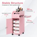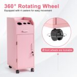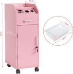 This mobile hair salon storage cart features 3 dedicated stainless steel tool holders for blow dryers and curling irons, 4 spacious ABS drawers for organization, and a secure lock with keys. The slide-out side tray saves space when not in use. Four casters (two lockable) provide easy mobility and stability. Made with durable particleboard and ABS materials.