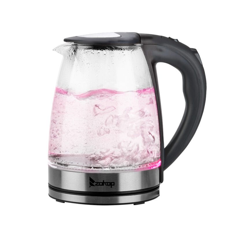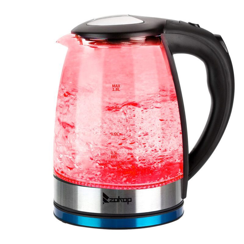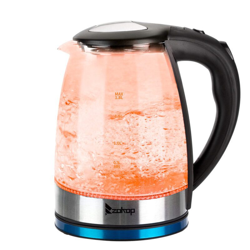 The ZOKOP HD-1861-A Electric Glass Kettle combines style with efficient performance. This 1.8L kettle boils water quickly using 1200W power, saving energy compared to stovetop kettles. Features a modern design with 7 color options and LED illumination during operation. The large pouring spout includes a mesh filter for spill-resistant pouring. Ideal for preparing tea, coffee, oatmeal, and soups.
