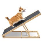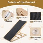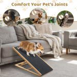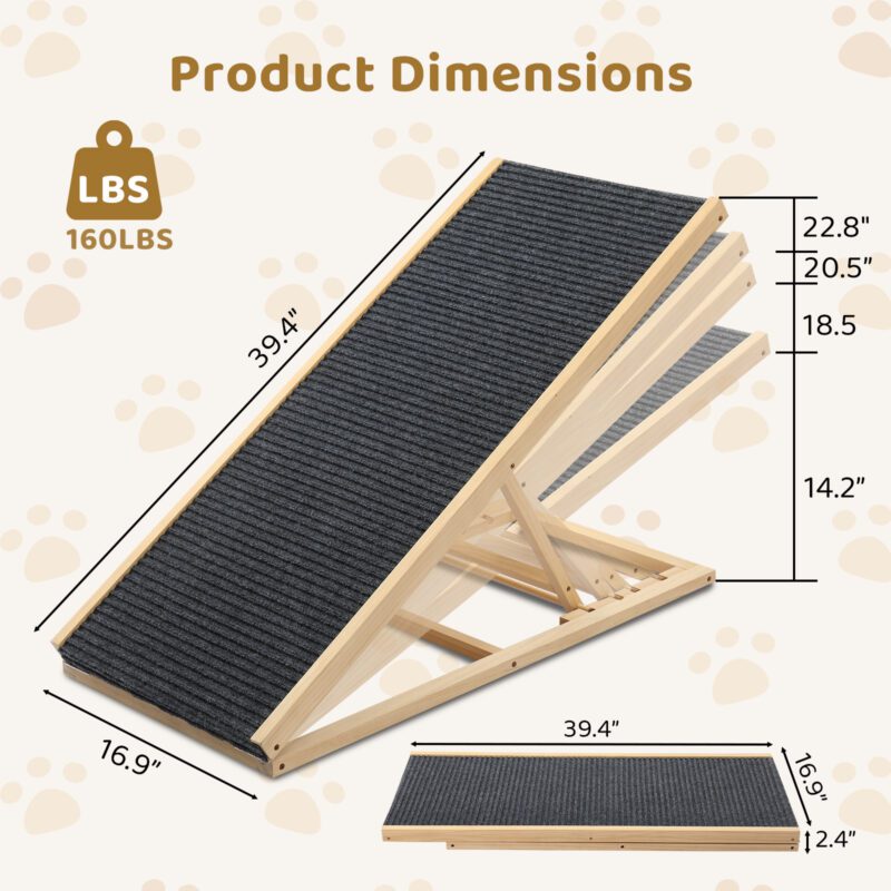 Provide comfort and independence for your furry friend with this sturdy, adjustable pet ramp. Designed for small and large dogs, it helps pets safely reach high beds, couches, and vehicles without joint strain. Features four adjustable heights (14.2, 18.5, 20.5, 22.8 inches) to accommodate different surfaces. The soft fabric-covered surface ensures secure grip, while durable pine wood construction with non-slip foot pads offers stability. Foldable design allows easy storage and transport. Ideal for aging or small pets needing mobility assistance. Folded dimensions: 39.4 x 17 x 2.4 inches. Net weight: 7.7 lbs.