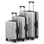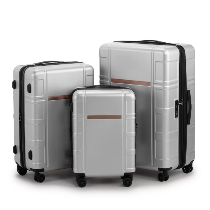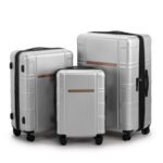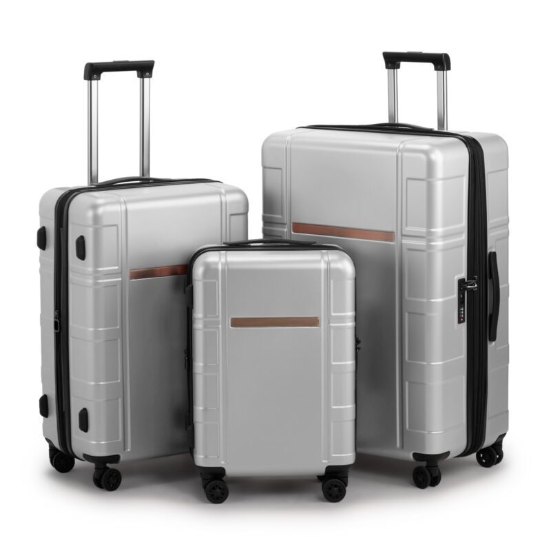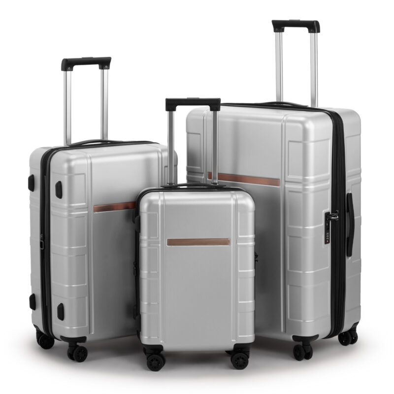 Ideal for personal and business travel, this airline-compliant luggage set features durable PC+ABS construction with impact-resistant hard shells. The expandable design adds 15% packing space across all sizes. Key features include TSA-approved locks for security inspections, 360-degree silent spinner wheels for smooth mobility, telescopic handles with 3-step adjustment, cushioned top handles, and protective bumper feet to minimize wear. Set includes 20-inch (1-4 day trips), 24-inch (4-7 day trips), and 28-inch (7-9 day trips) suitcases in silver. Material: ABS+PC. Lock Type: TSA Mechanical Lock.