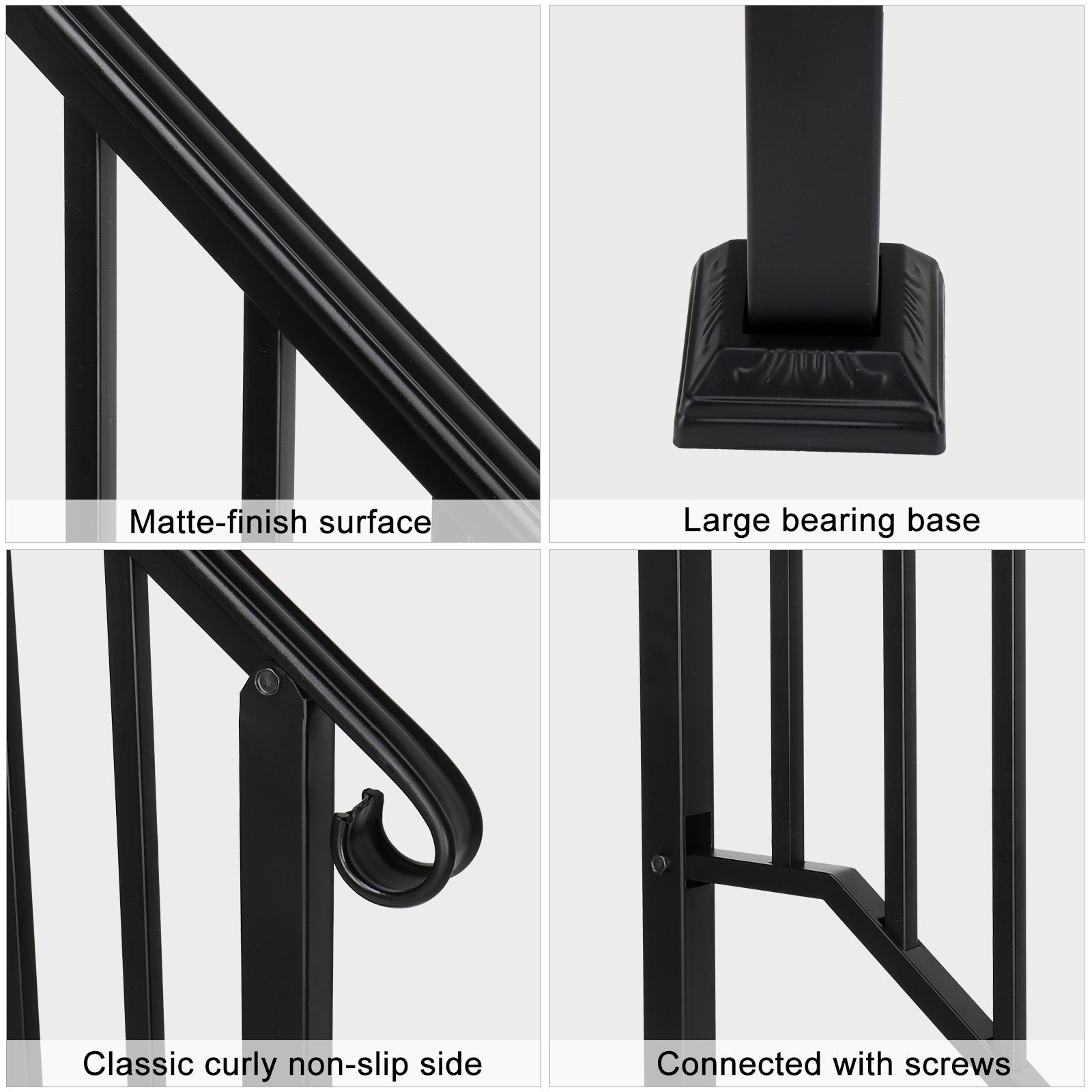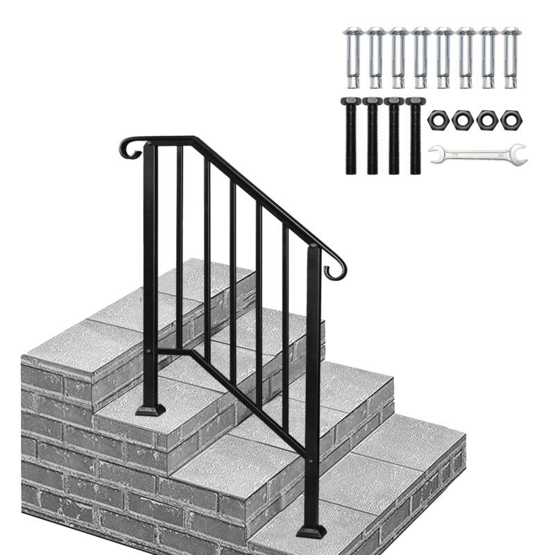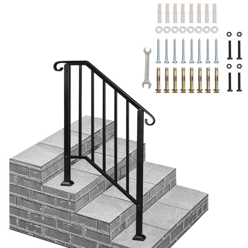 Enhance your outdoor steps with this matte black iron handrail, designed for 2 or 3 steps. Its flexible design and smooth, curved shape provide safety and modern style. Constructed from durable galvanized iron with rust-resistant powder coating, it features strong welded connections for reliability. Includes all installation hardware. Ideal for gardens, homes, offices, hotels, and commercial buildings.