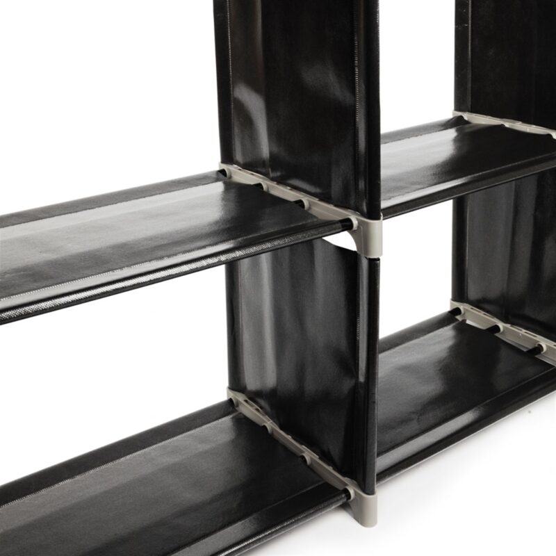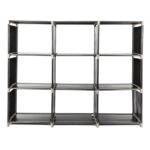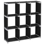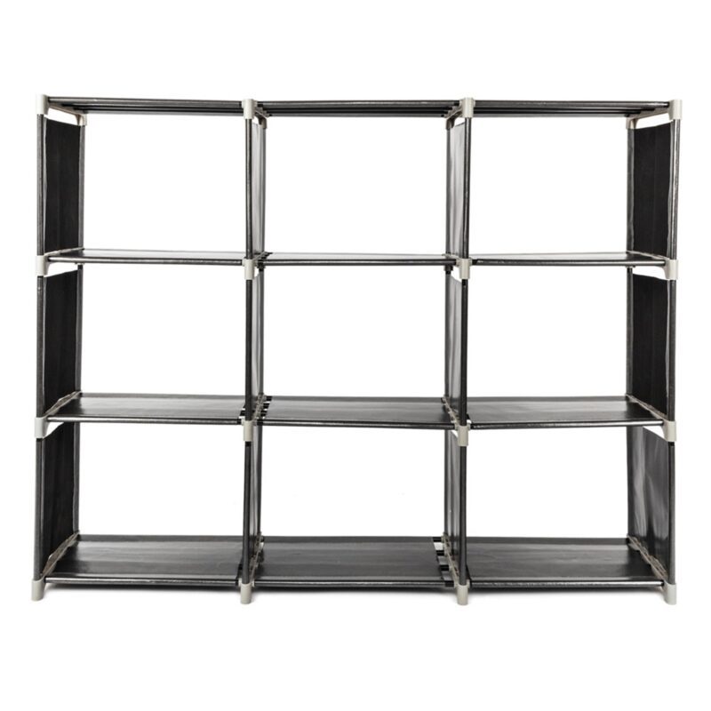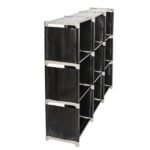 This versatile black storage shelf features 3 tiers and 9 compartments for efficient organization. Constructed with durable steel tubes, high-quality plastic connectors, and waterproof non-woven fabric shelves, it offers sturdy, long-lasting performance. Ideal for storing bathroom essentials like shampoo, towels, and body wash, or for use in kitchens, bedrooms, living rooms, and offices. The space-saving design maximizes storage while maintaining a compact footprint. Easy to assemble and clean.