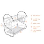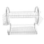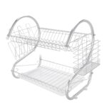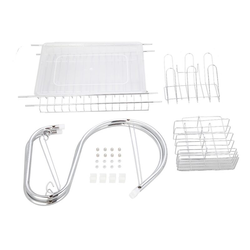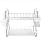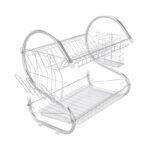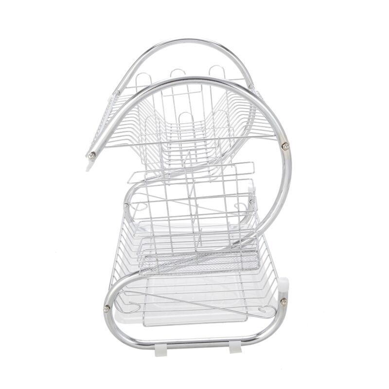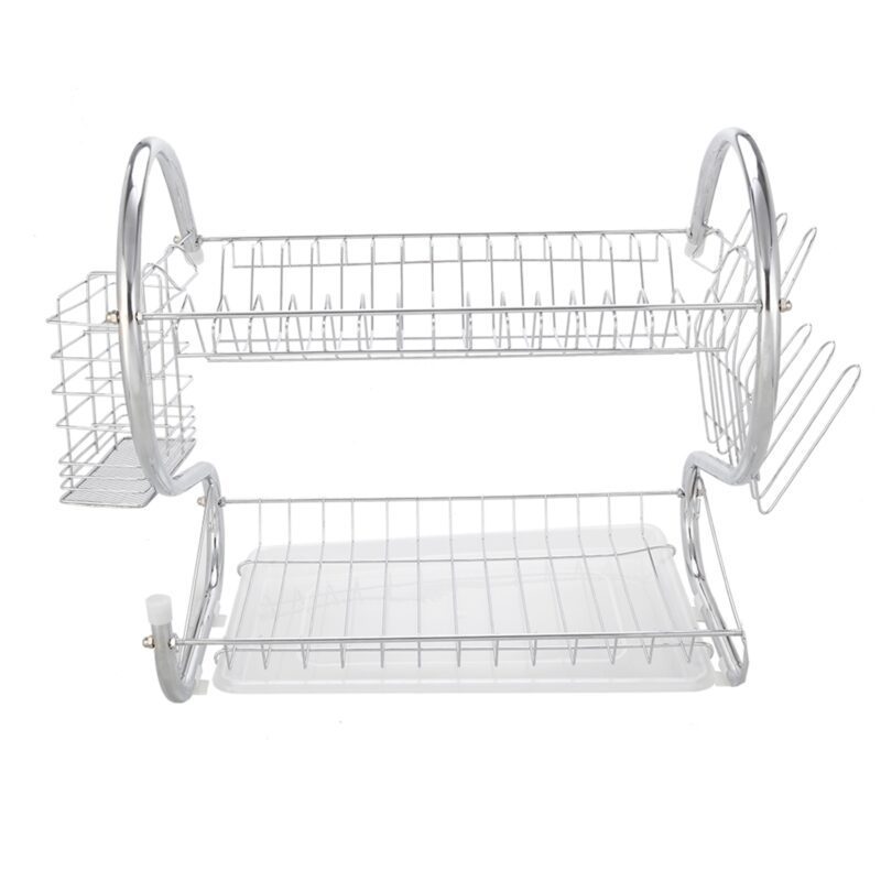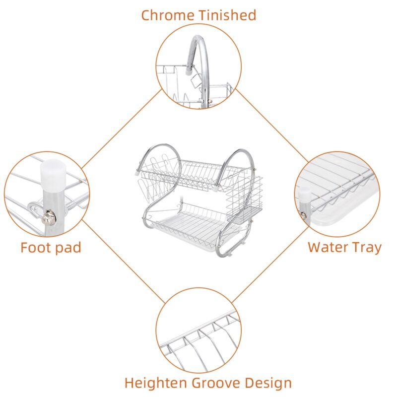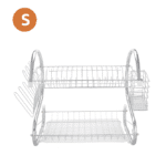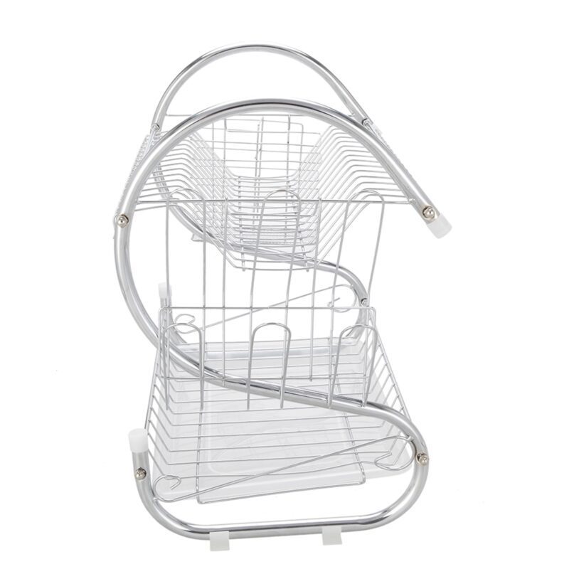 This S-shaped dual-layer dish drainer efficiently organizes and dries bowls, dishes, chopsticks, and spoons. Featuring a durable metal construction with electroplated silver finish, it provides a sleek, glossy surface. The two-tier design offers organized storage and easy access while saving counter space.