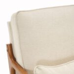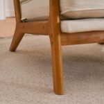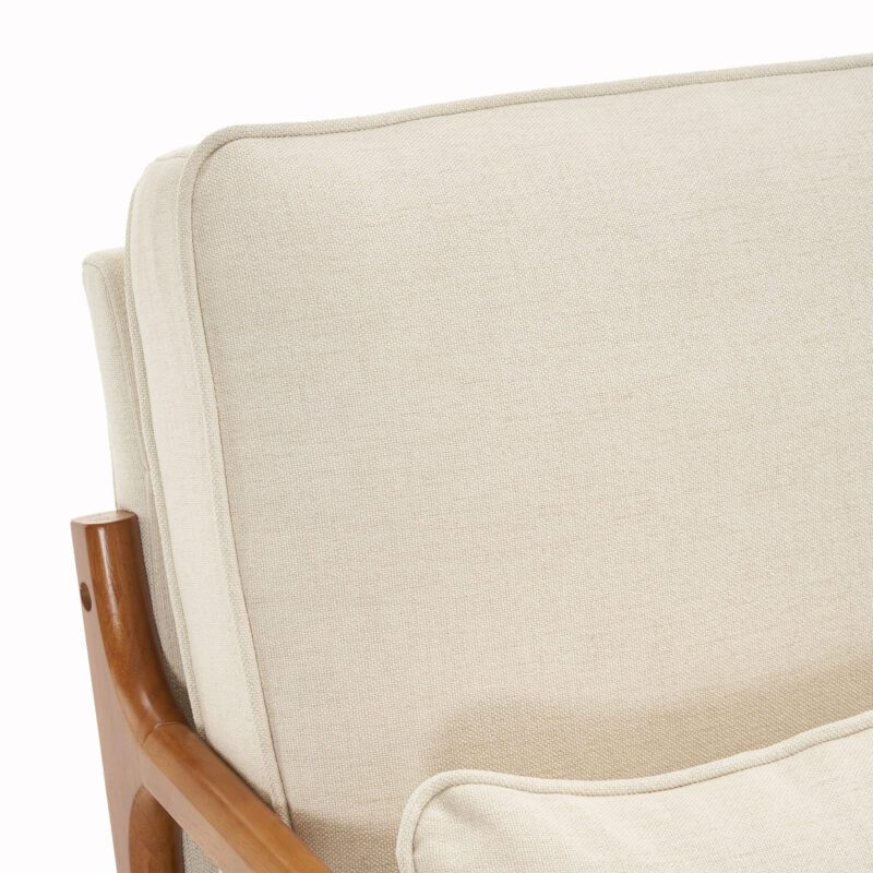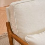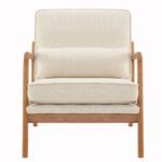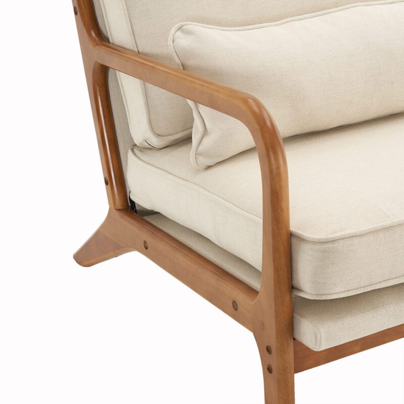 This oak-upholstered single lounge chair features solid wood armrests and a sturdy frame for lasting durability. Upholstered in off-white linen, it includes high-density foam cushions for firm comfort. Ideal for living rooms, studies, or balconies, this mid-century modern accent chair suits various home settings. Simple assembly required. Dimensions: 25.59 x 29.53 x 31.89 inches (65 x 75 x 81 cm). Weight: 30.86 lbs (14 kg). Package includes one lounge chair. Note: Minor wrinkles may appear initially but diminish within 24 hours or with use. Contact us for any missing/damaged parts.