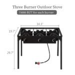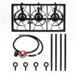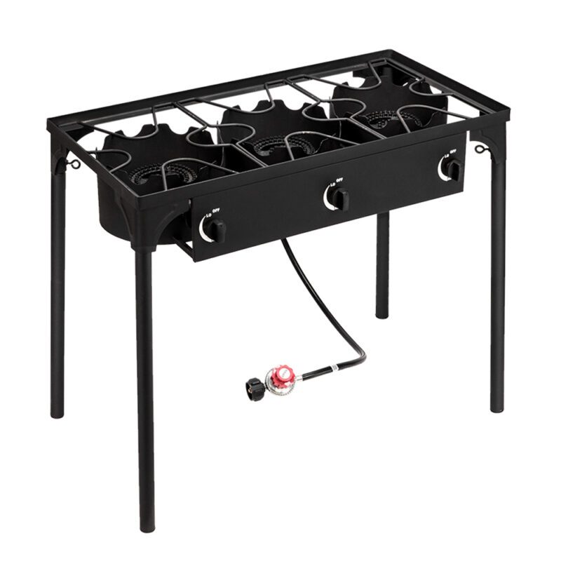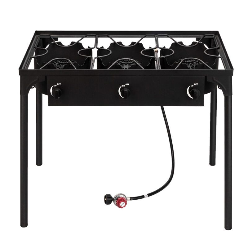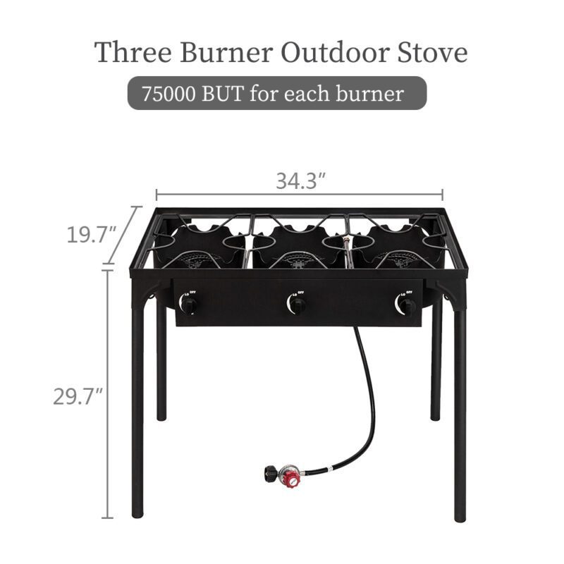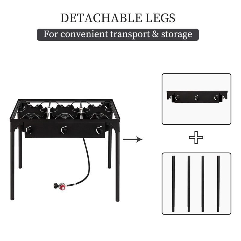 This three-burner outdoor stove features a durable cast iron construction with 225,000 BTU output. Adjustable flame control provides versatile cooking options, while the stable burner bracket accommodates various pot sizes. The removable legs enhance portability for outdoor activities.