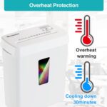 This P-5 security level paper shredder features micro-cut technology that shreds documents into 2x12mm particles. It handles up to 6 sheets at once without requiring staple or clip removal. The shredder operates continuously for 5 minutes before automatic overheating protection activates, requiring a 30-minute cooldown period (ETL certified). Jam-proof reverse (REV) function with three control modes (Auto/Off/Reverse) clears paper jams. Includes a 3.43-gallon basket with transparent fullness indicator window. Heavy-duty construction for home or office use. Contact us for customer support.