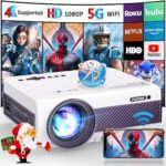 Experience large-screen entertainment with this portable projector featuring native 1080P Full HD resolution and 4K support. Dual-band WiFi (5G and 2.4G) ensures stable streaming, while Bluetooth 5.1 connects audio devices. Adjust screen size from 50% to 100% with zoom functionality without moving the projector. Compatible with iOS, Android, laptops, TV sticks, HDMI, USB, and VGA devices. Includes sleep timer, low-noise operation, and eye-protective diffuse reflection technology. Supports table, tripod, or ceiling installation. Ideal for home, outdoor, gaming, and business use. Package includes projector, HDMI cable, AV cable, power cable, remote control, lens cap, and user manual.