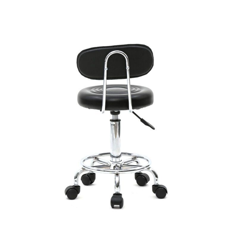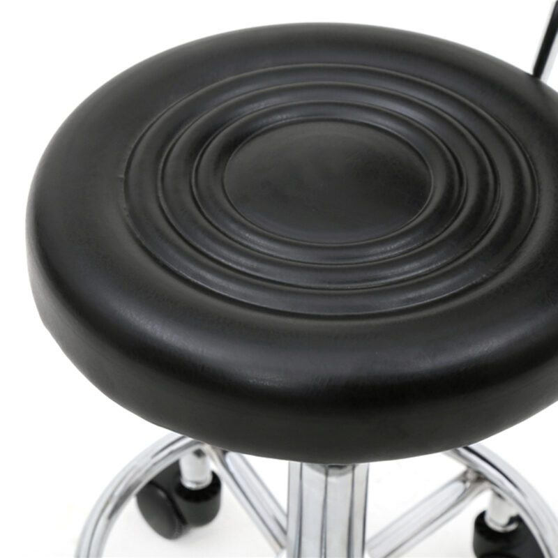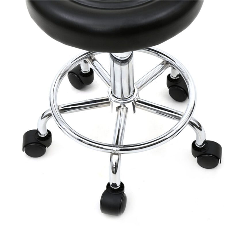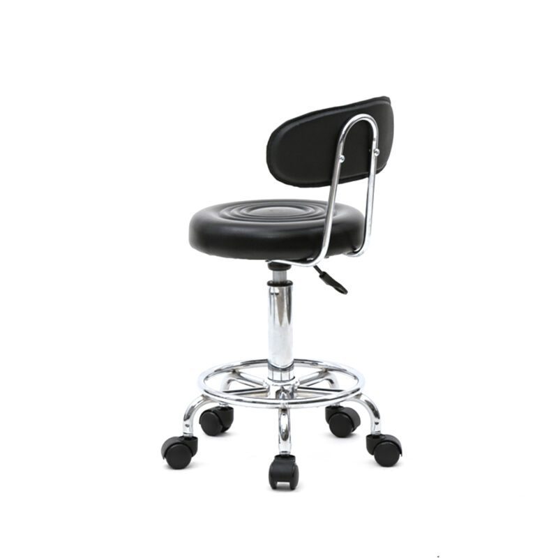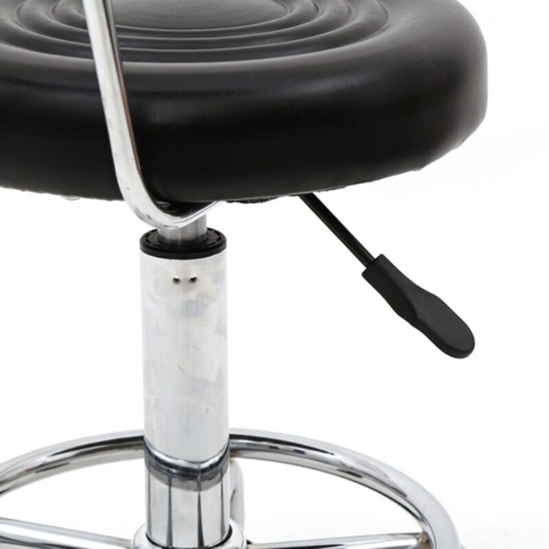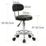 This round-shaped adjustable salon stool features a supportive backrest for comfort. Constructed with durable PU leather, sponge cushioning, and chrome-plated iron, it offers long-lasting performance. Lightweight and portable design enables easy movement. Includes anti-skid base and anti-rust materials for safety. Provides 360-degree rotation and adjustable seat height from 18.5 to 24.21 inches (47-61.5 cm). Ideal for salon, home, or office use. Color: Black. Dimensions: 13.39 x 13.39 x 32.87 inches (34 x 34 x 83.5 cm). Package includes stool and manual.