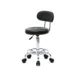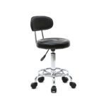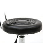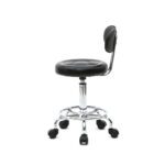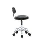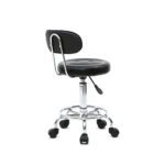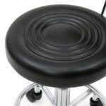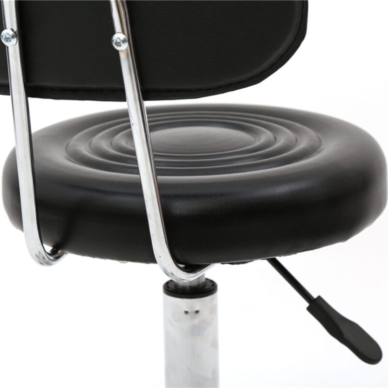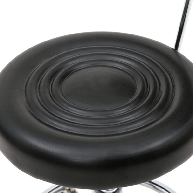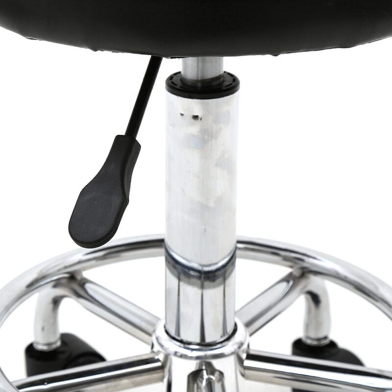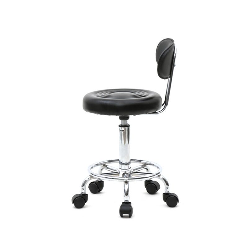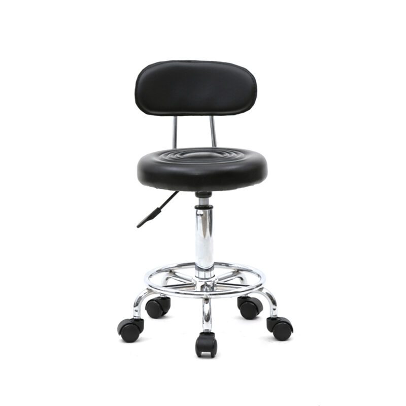 This round-shaped adjustable salon stool features a supportive backrest for comfort. Constructed with durable PU leather, sponge cushioning, and chrome-plated iron, it offers long-lasting performance. Lightweight and portable design enables easy movement. Includes anti-skid base and anti-rust materials for safety. Provides 360-degree rotation and adjustable seat height from 18.5 to 24.21 inches (47-61.5 cm). Ideal for salon, home, or office use. Color: Black. Dimensions: 13.39 x 13.39 x 32.87 inches (34 x 34 x 83.5 cm). Package includes stool and manual.