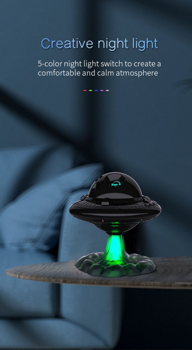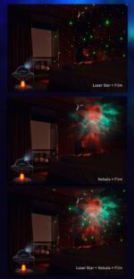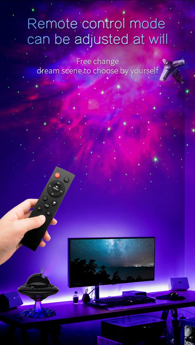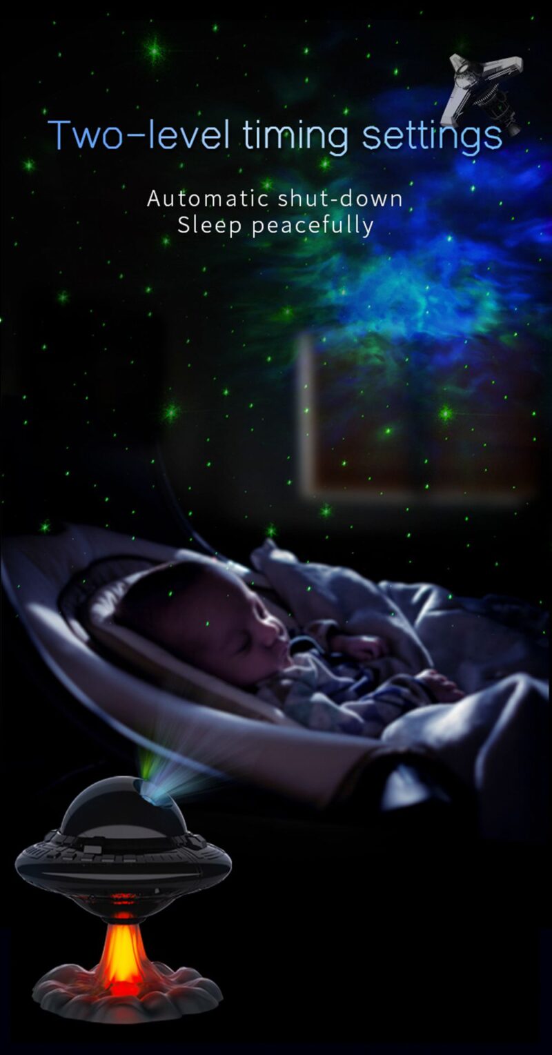 This projection lamp simulates a real starry sky with breathing stars for a dreamy ambiance. Features include adjustable star brightness with three breathing modes, customizable nebula speed and brightness across 8 color options, and flexible projection angles. Use nebula and stars together or separately, with UFO take-off jet lighting effects and customizable spaceship patterns. Includes two timing modes (45 min and 90 min) for versatile use.