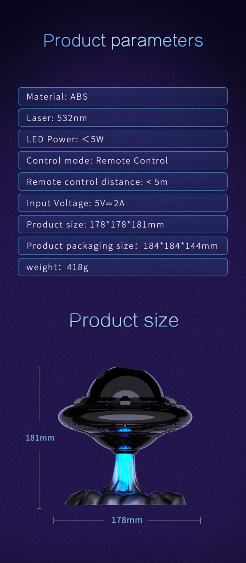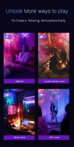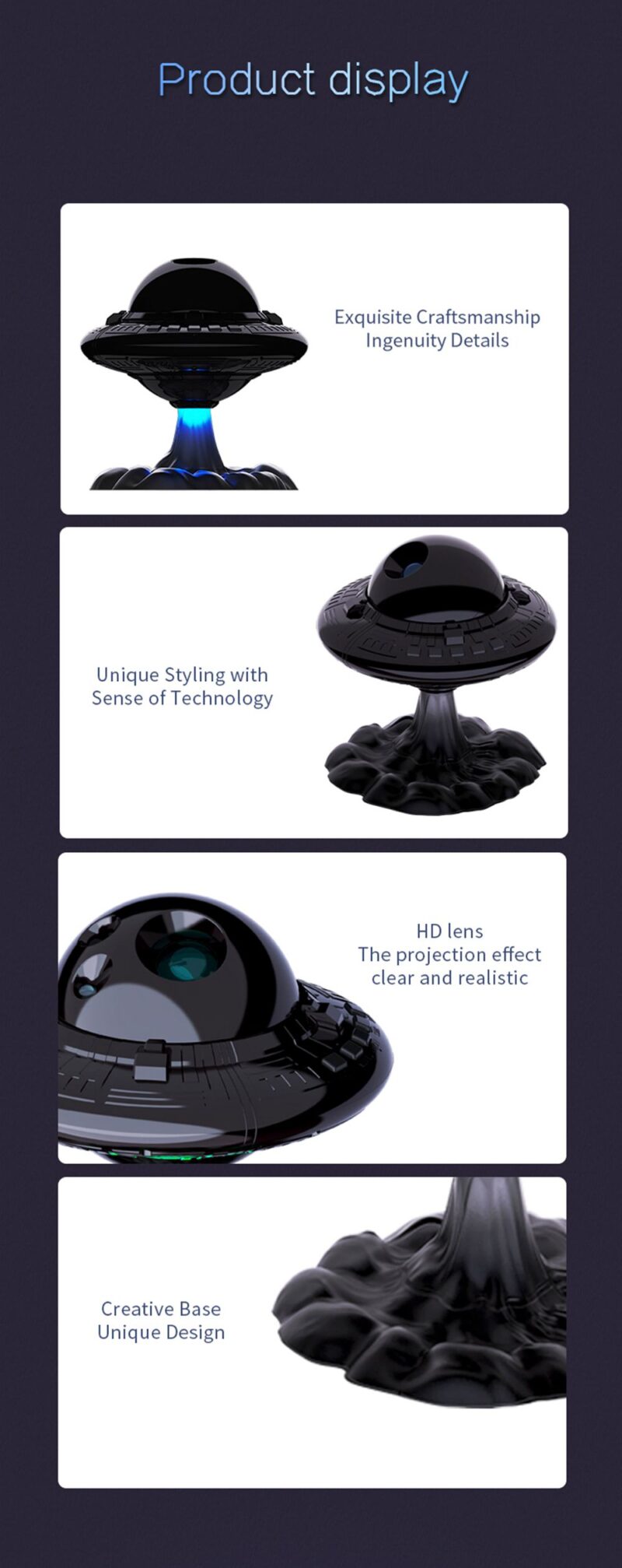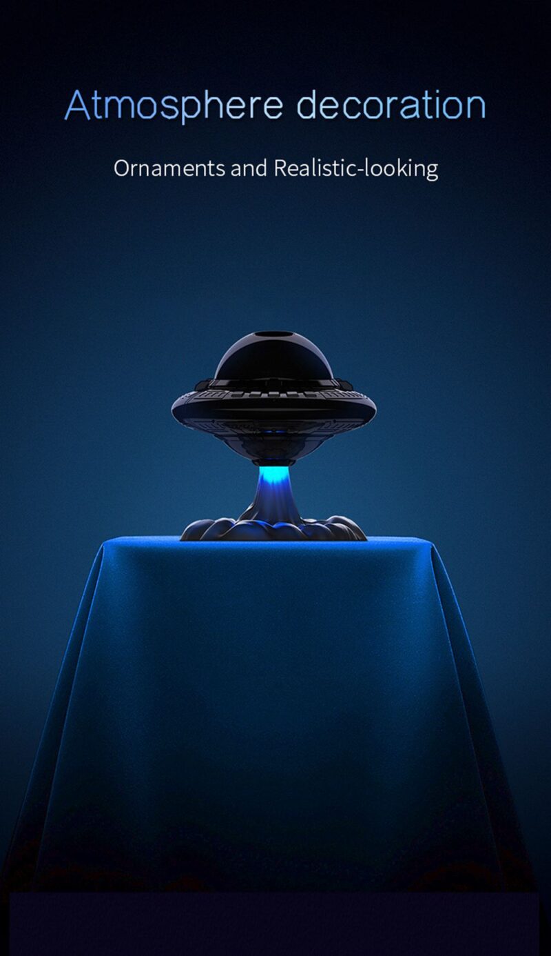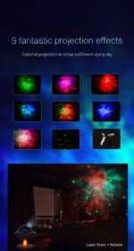 This projection lamp simulates a real starry sky with breathing stars for a dreamy ambiance. Features include adjustable star brightness with three breathing modes, customizable nebula speed and brightness across 8 color options, and flexible projection angles. Use nebula and stars together or separately, with UFO take-off jet lighting effects and customizable spaceship patterns. Includes two timing modes (45 min and 90 min) for versatile use.