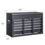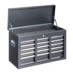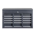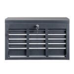 Organize tools efficiently with this black steel tool box featuring 5 drawers. Dimensions: 60.3cm length, 26cm width, 38.4cm height. Includes 10.7cm carrying handle. Drawer specifications: four 4cm-height drawers and one 8.4cm-height drawer, all with 22.4cm depth and 53.2cm length. Package includes one durable tool box.