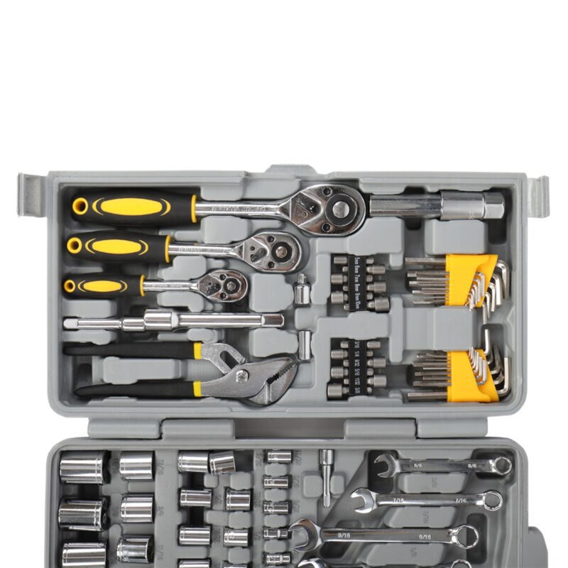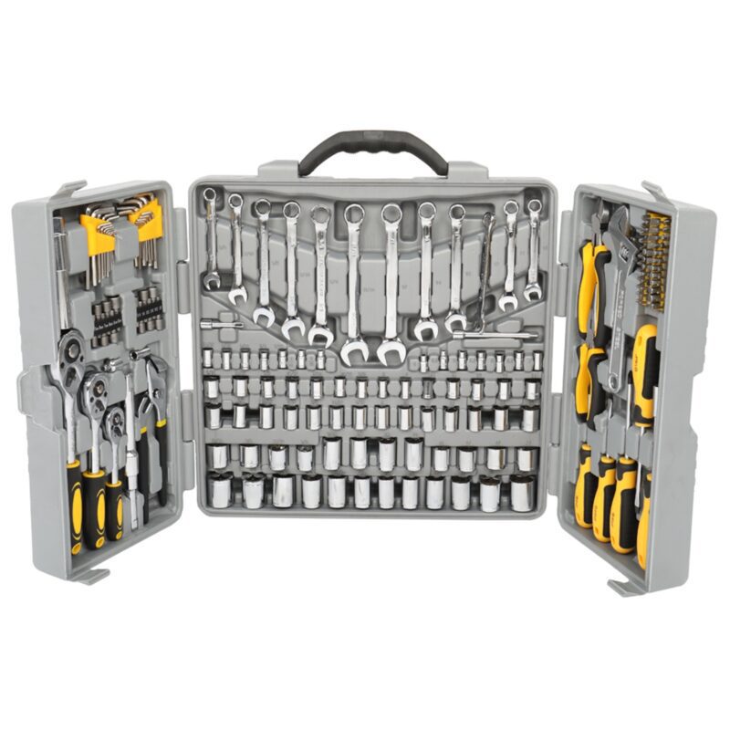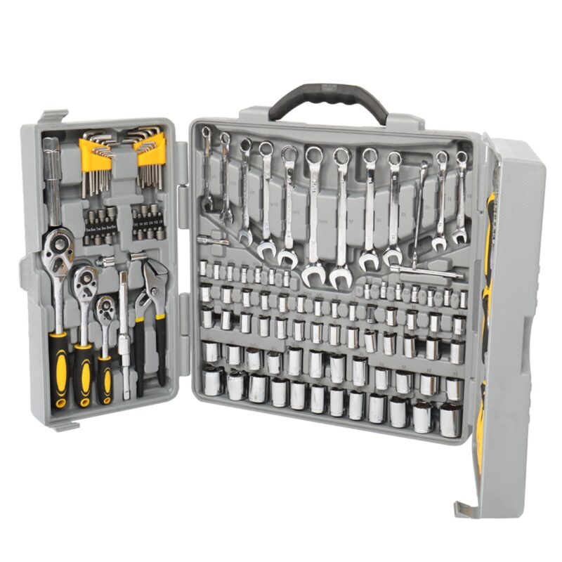This comprehensive mechanics tool set contains essential tools for basic household and vehicle repairs. Featuring chrome vanadium construction for durability and corrosion resistance, the tools are organized in a sturdy blow-molded case for secure storage and portability. Ideal for hanging, box opening, screw tightening, and general maintenance tasks.