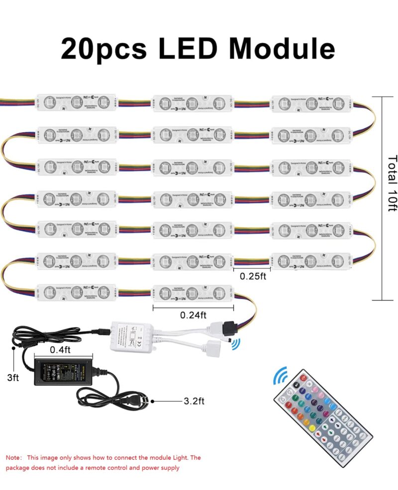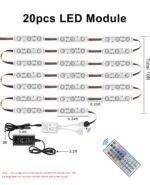 This waterproof 5050 SMD RGB LED module light is designed for commercial signage applications. With an IP65 waterproof rating, it provides reliable illumination for store front letters, advertisement signs, and light boxes. Specifications include DC12V operation, 15-18LM brightness per LED bead, 0.72W power consumption per module, and a wide 140° beam angle. Ideal for channel letter lighting, billboards, boat cabins, stair lighting, and as an energy-efficient replacement for incandescent bulbs. Professional installation required. Package includes one module light (remote and power supply not included).