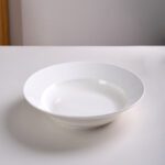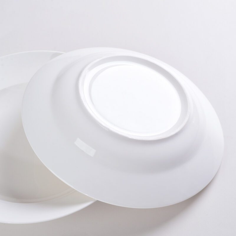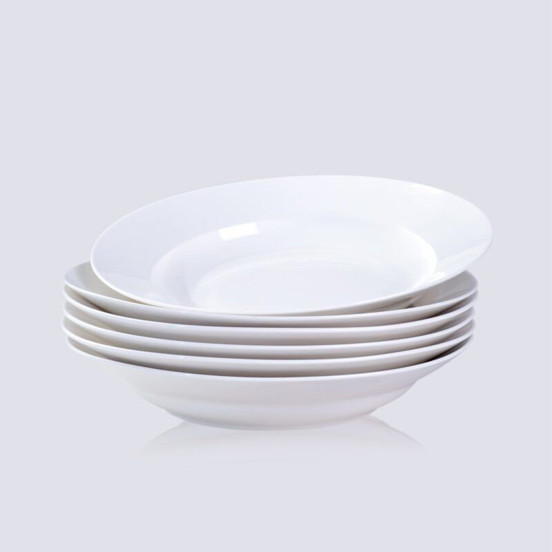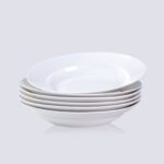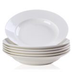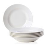 Set of 6 white ceramic dinner plates featuring a 9.5-inch round design with lifted edges to prevent spills. Stackable for efficient storage and suitable for any decor. Dishwasher, microwave, and oven safe (up to 248°F), with scratch-resistant glaze. Ideal for daily meals and special occasions. Dimensions: 9.5″ diameter, 1.8″ depth. Capacity: 21oz full / 10.5oz half. Each plate weighs 0.88 lbs.